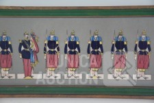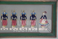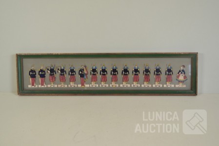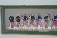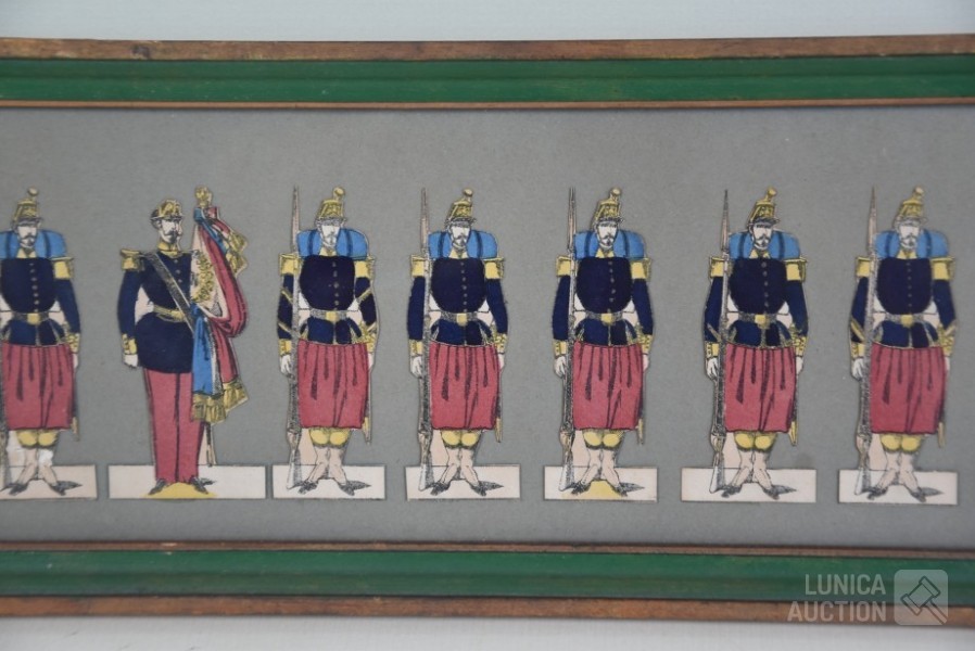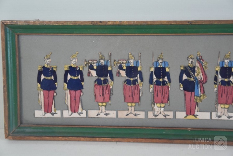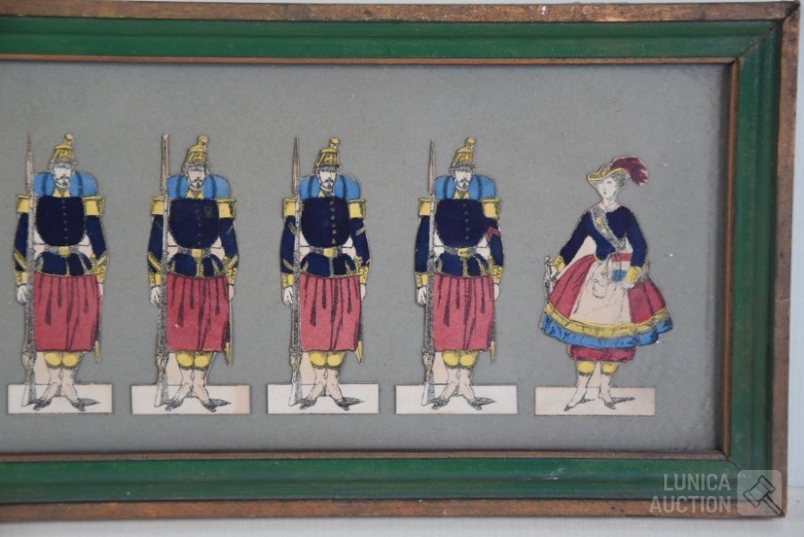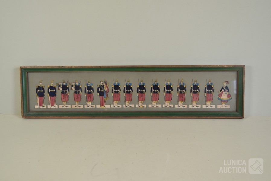 19e eeuws, achter glas, ingekleurde gravures, uitgeknipt/uitgesneden. Afmeting lijst 63x15 cm!.