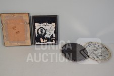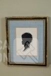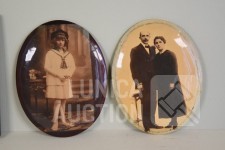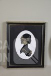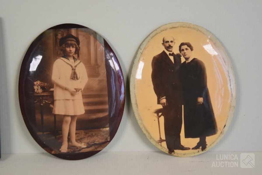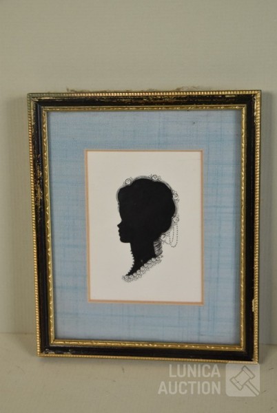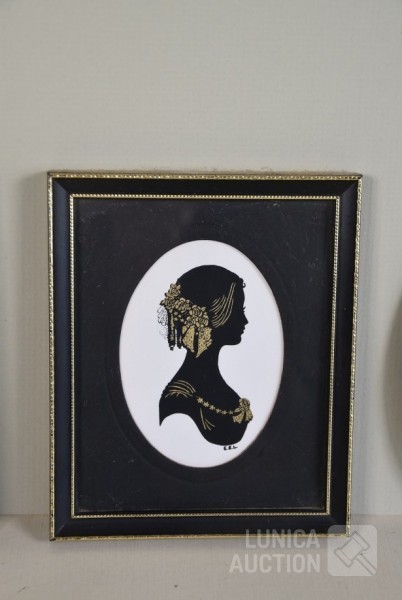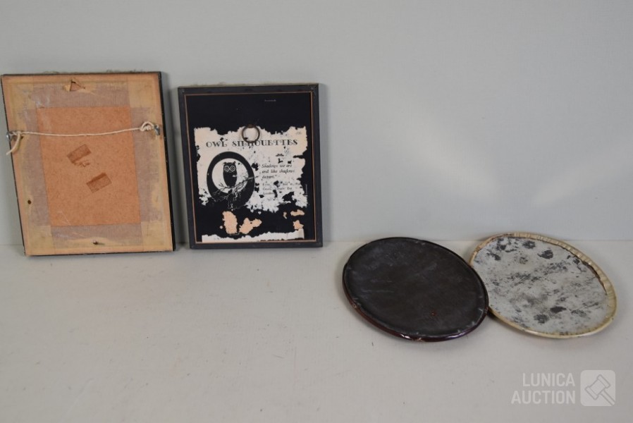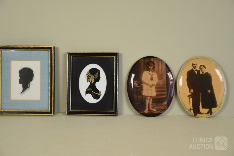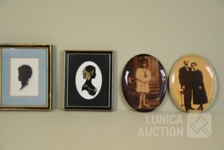 2x silhouetten, ingelijst, achter glas. Afmeting 12x14 cm; 2x oude foto, op blikken ondergrond, ovaal, afmeting 10x14 cm.