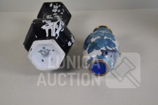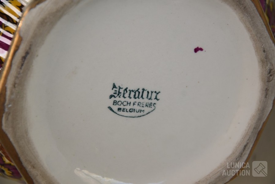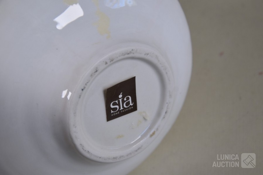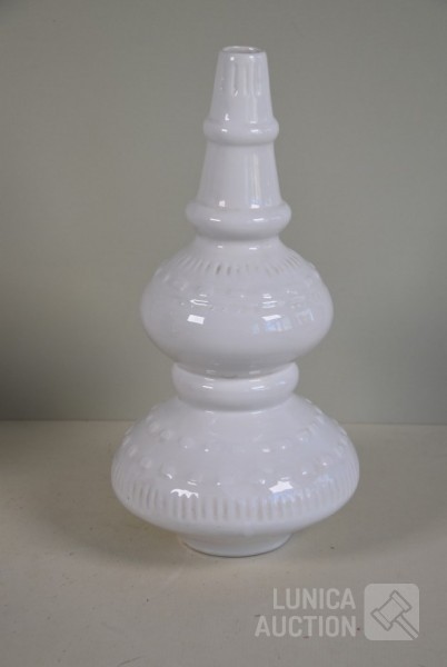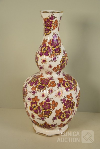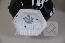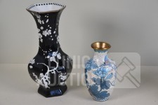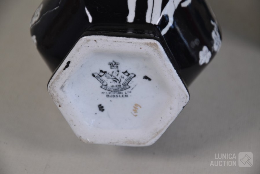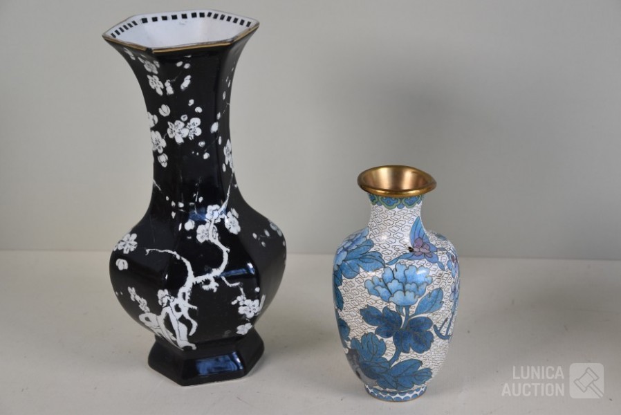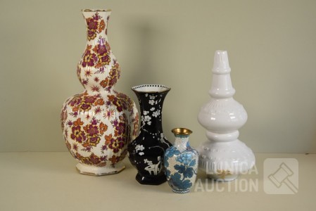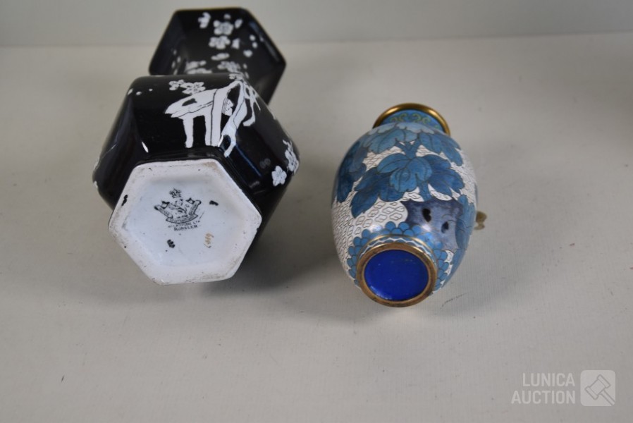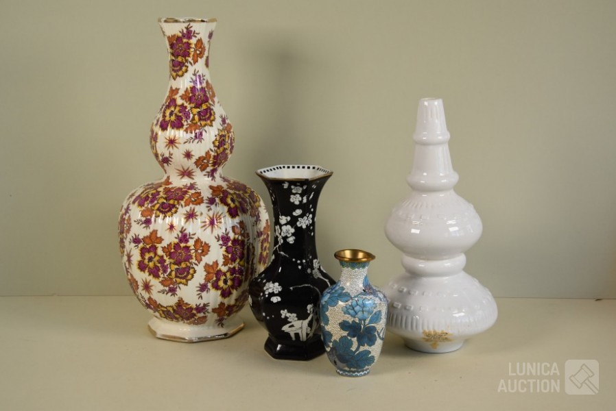 Cloisonne vaas, hoogte 15 cm; Porseleinen vaas met floraal decor, kleur zwart, Royal Staffordshire pottery Burslem, hoogte 25 cm; Vaas, wit aardewerk, SIA Home Fashion, hoogte 34 cm; Grote BOCH Keralux vaas, met vergulde rand (sleets), hoogte 44 cm!.