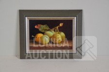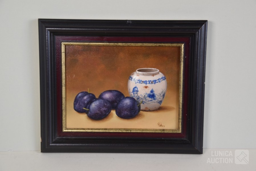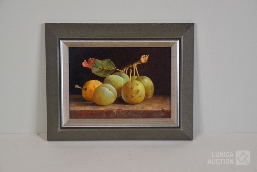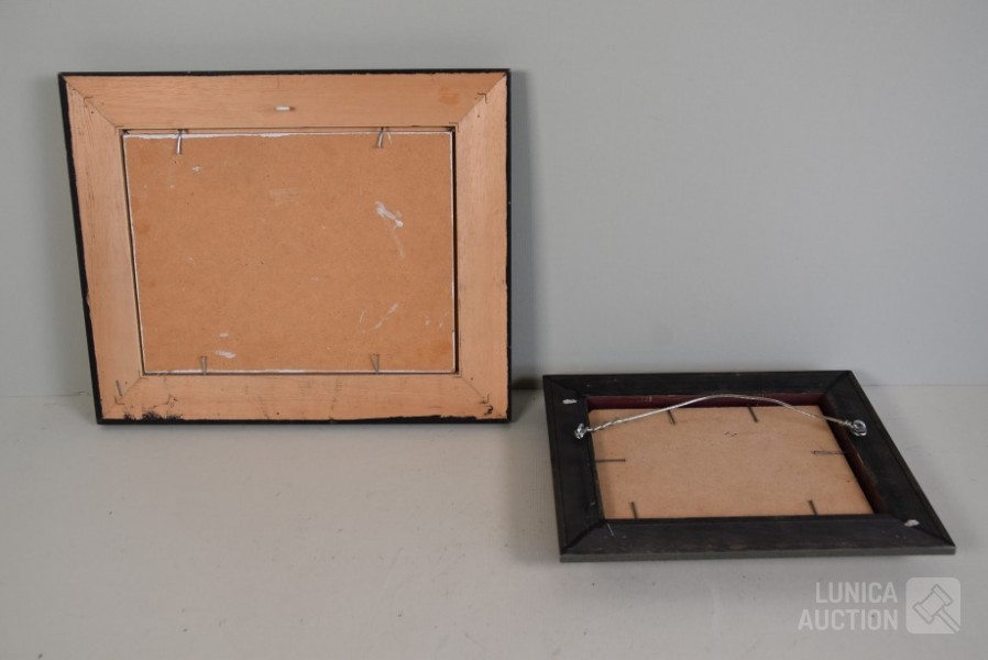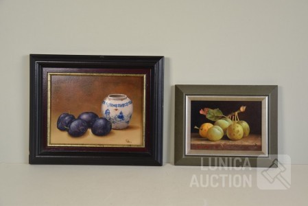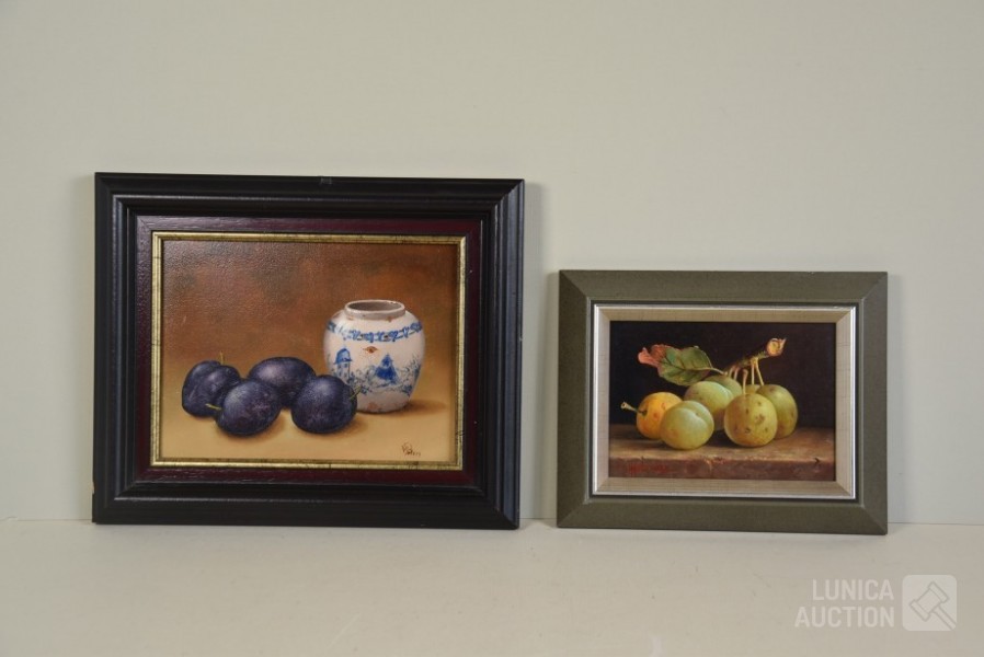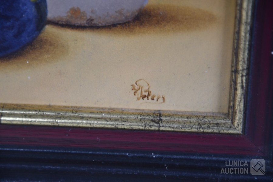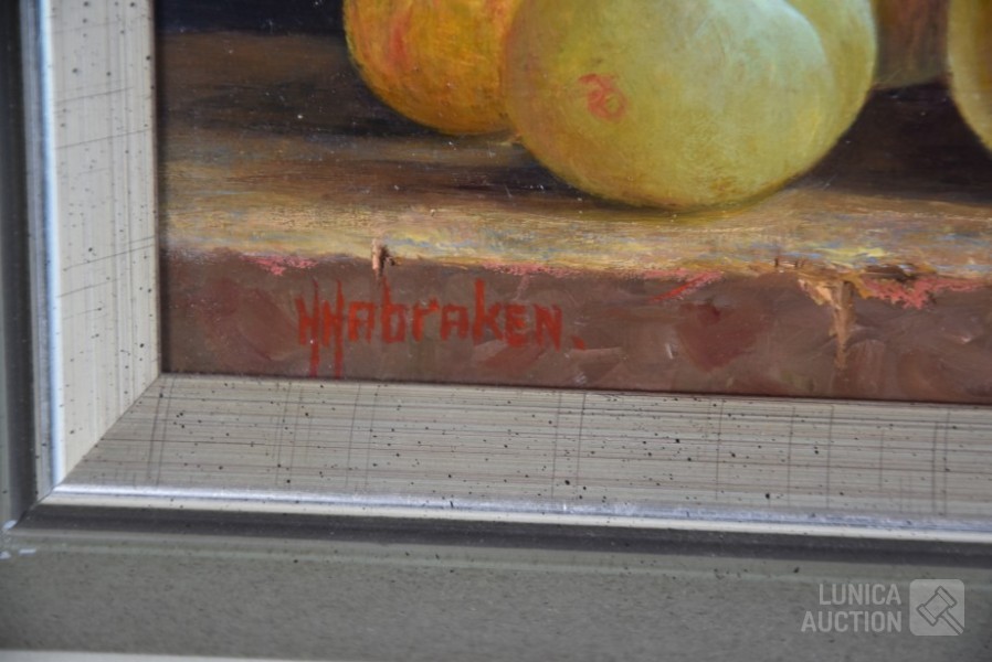 olieverf op paneel. Hans HABRAKEN (1946), gesigneerd L.O., ingelijst 25x20 cm.; PETERS, gesigneerd R.O., ingeliijst, afmeting 33x27 cm.