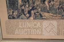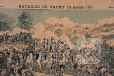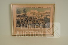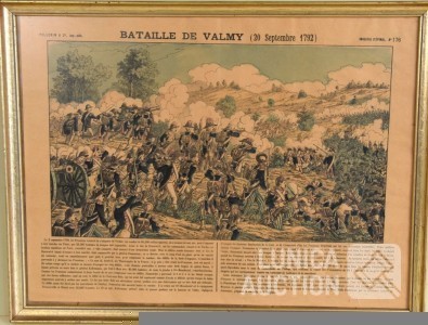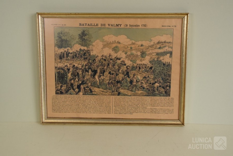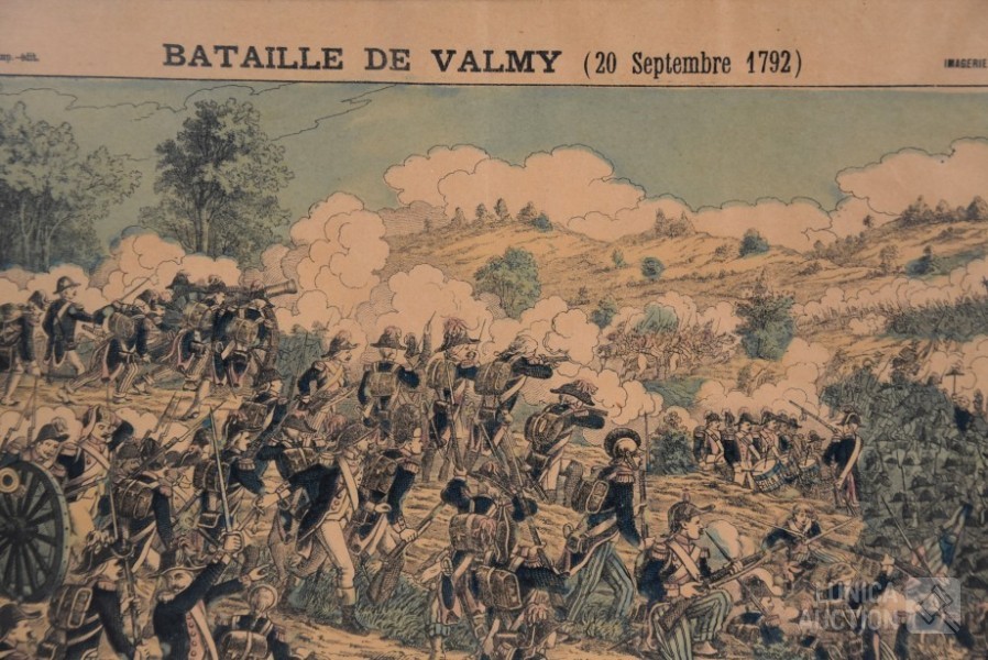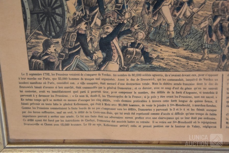 De slag bij Valmy , 20 september 1792, is een cruciaal moment in de Franse revolutionaire oorlogen. Ingekleurde litho, ingelijst achter glas. Afmeting 43x32 cm.