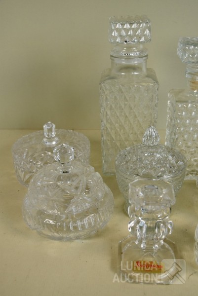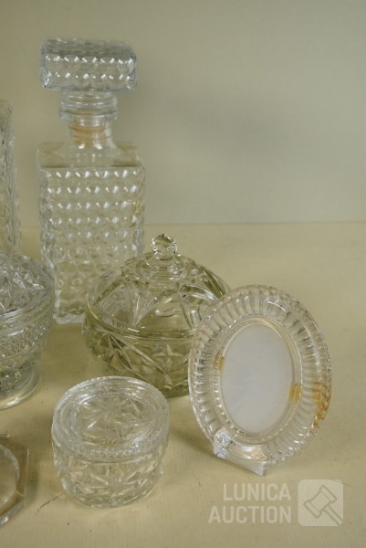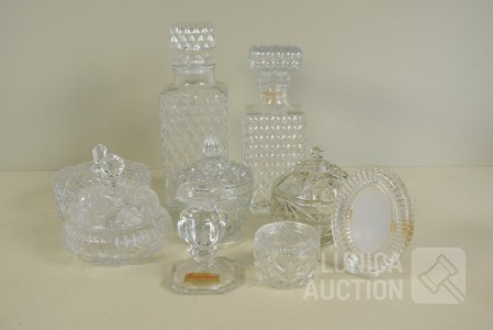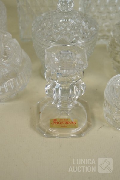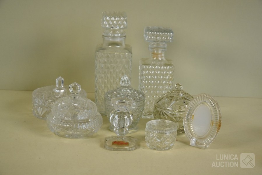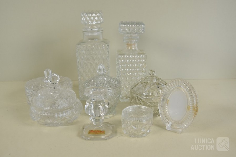O.a. NACHTMAN. O.a. Bonbonnières in diverse afmetingen; Fotolijst, afmeting 12x9 cm; Karaffen, hoogte 22 cm en 25 cm.