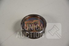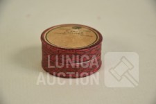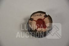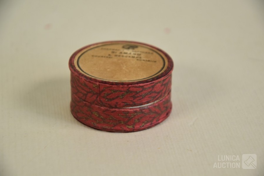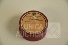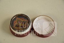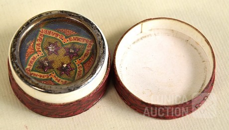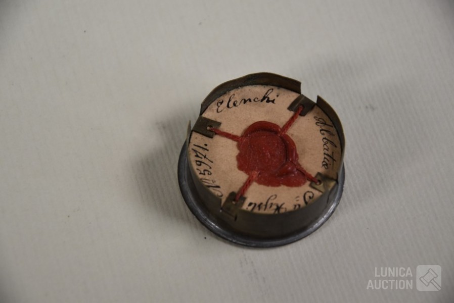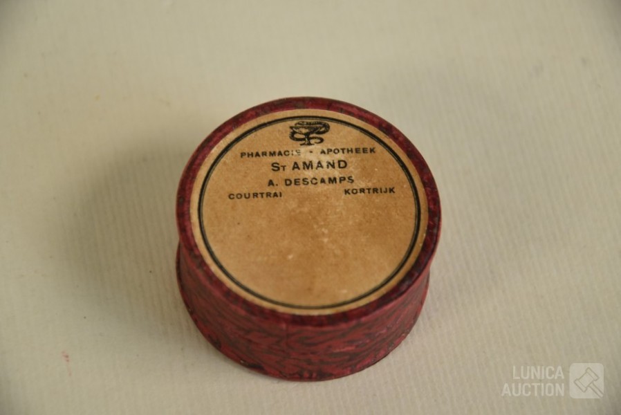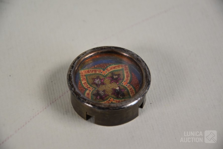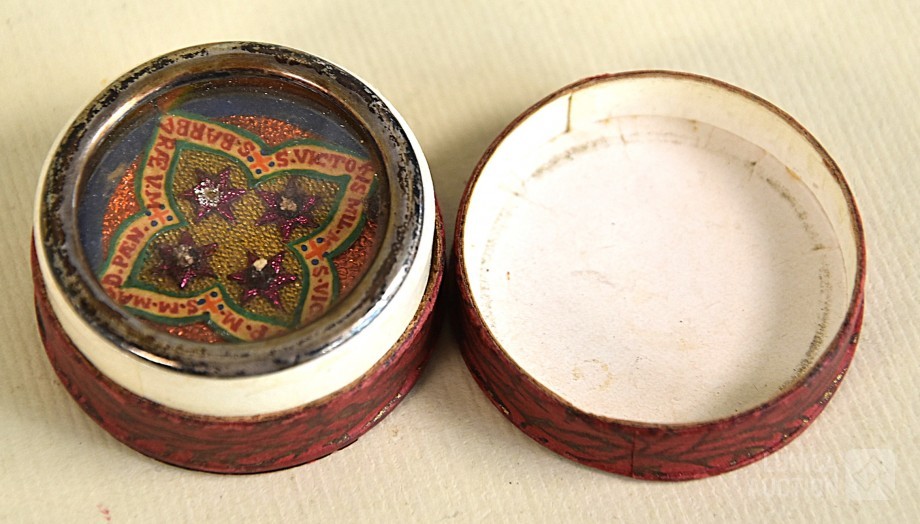 Multitheca met relikwieën. Op de Achterijde"Elenchi, Abbatio J Mysti n 5971". Zit in antiek pillendoosje van Apotheek St Amand A. Descamps, Kortrijk. Doorsnede 4 cm.