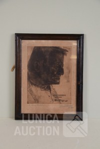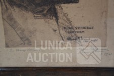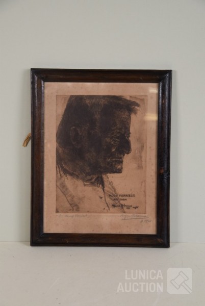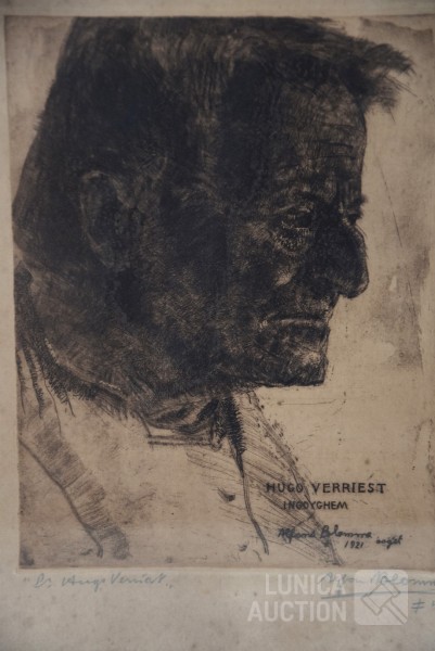 "portret Hugo Verriest, 1921" In ets gesigneerd en handgesigneerd R.O.; ingelijst, achter glas. Afmeting 30x40 cm