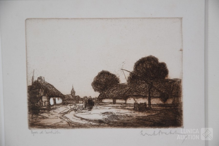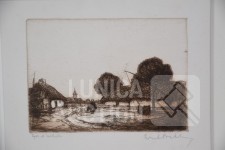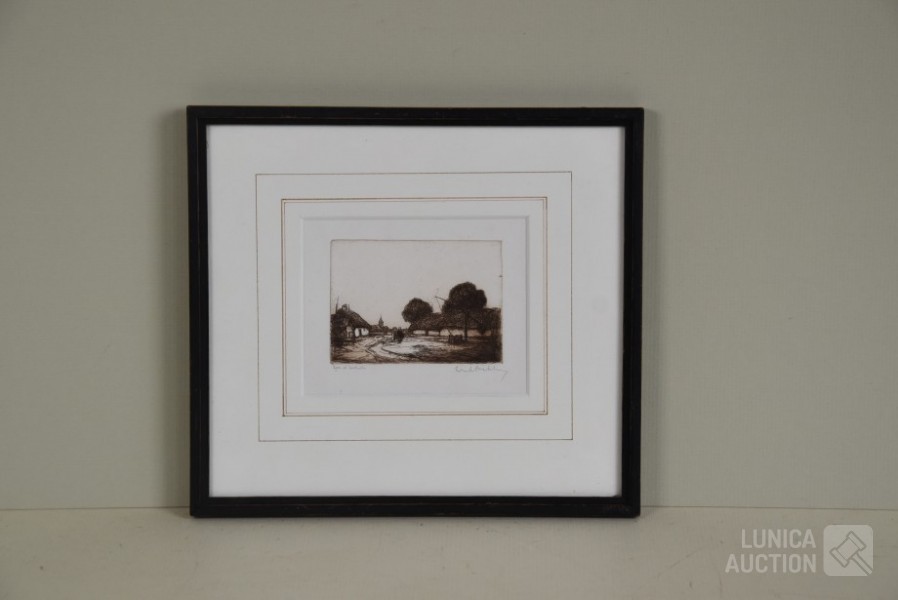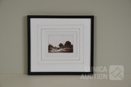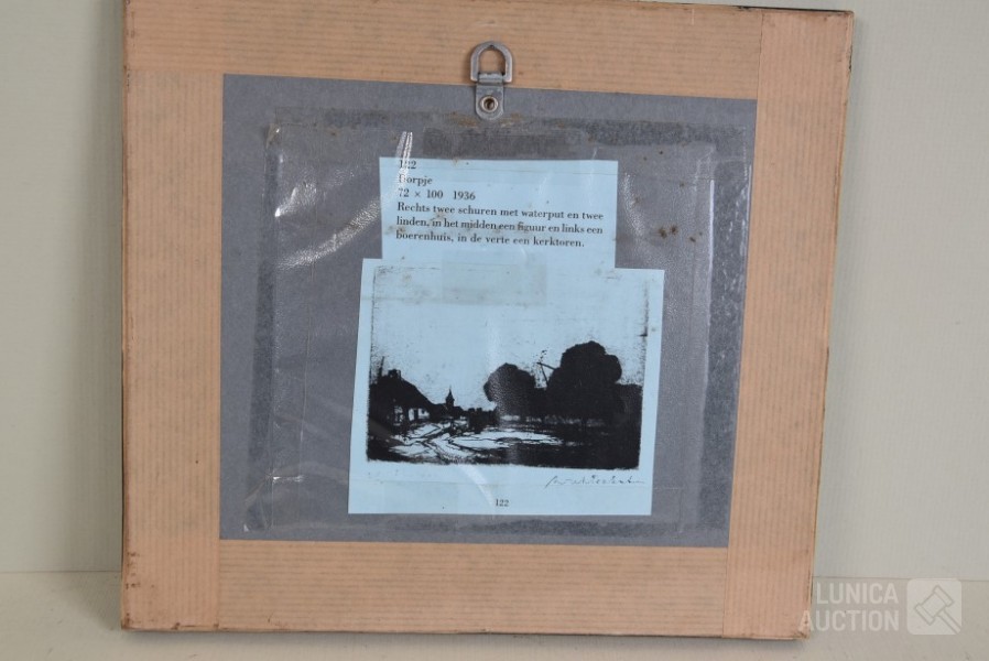 Handgesigneerd R.O., eigen druk. "dorpje". Ingelijst achter glas.