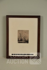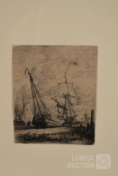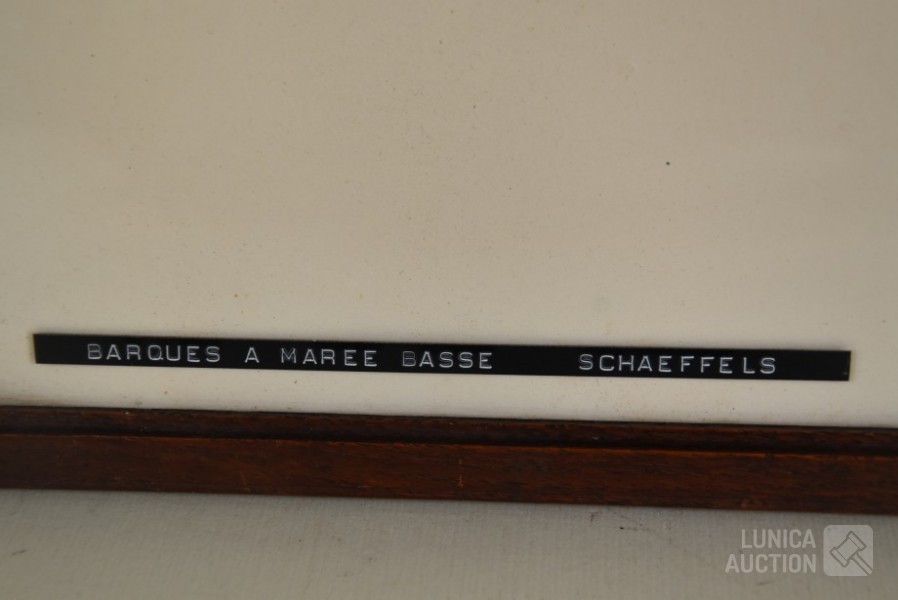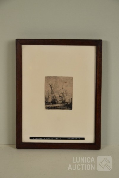 Gesigneerd in gravure/ets. Titel: "Baraques a maree basse". Ingelijst, achter glas. Afmeting 24x30 cm.