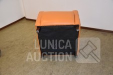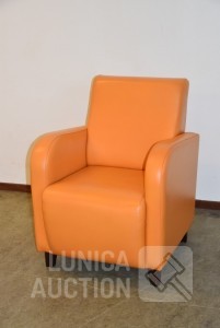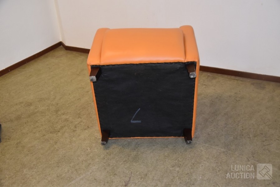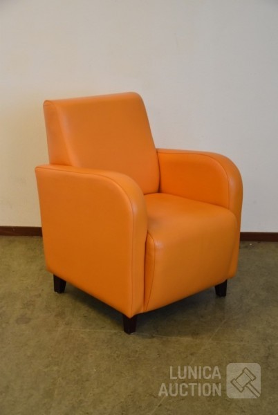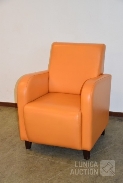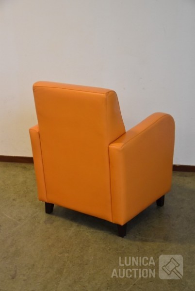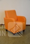 Kleur: oranje, met houten poten. Afmeting (bxdxh) 70x75x90 cm