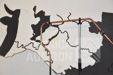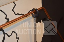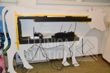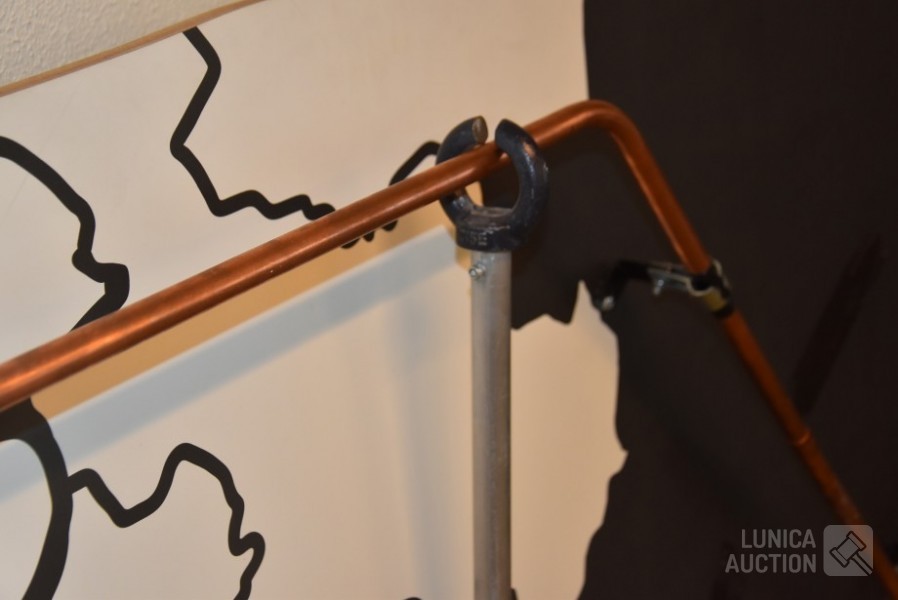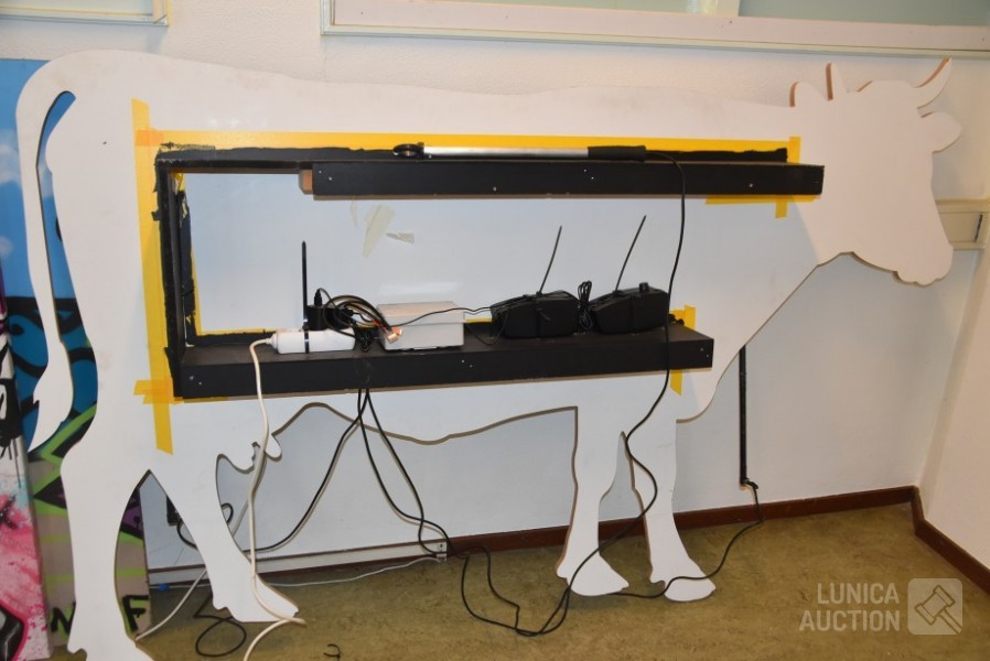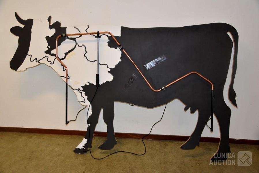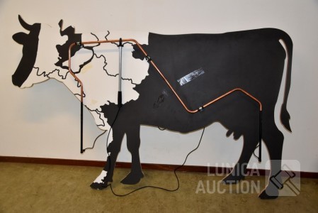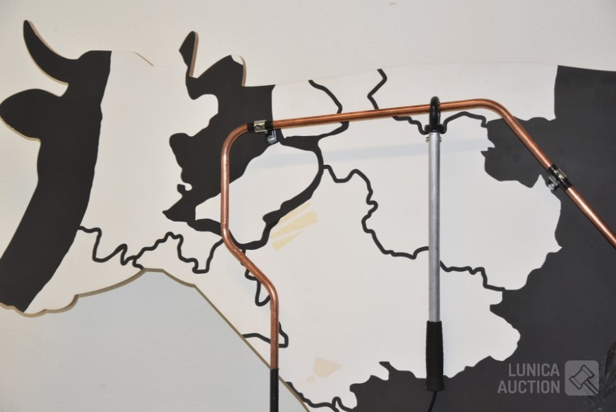 Werkend, als je het ijzer aanraakt met de staaf gaat de koe loeien. Afmeting (bxdxh) 220x25x130 cm.! Koe, op ware grote, moet worden opgehangen aan achtergrond/wand. Voorkant. Op voorkant zijn taperesten zichtbaar. Uniek exemplaar. Ideaal voor evenementen.