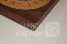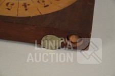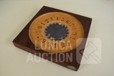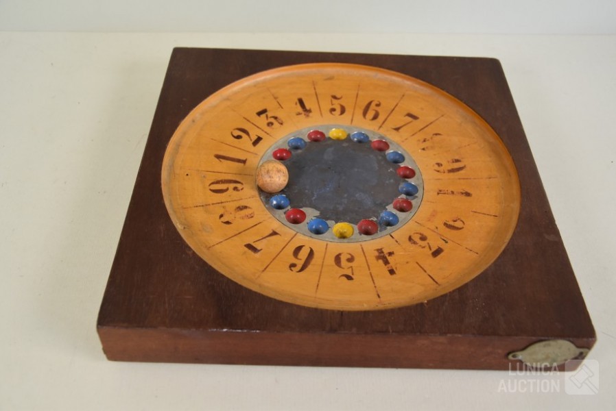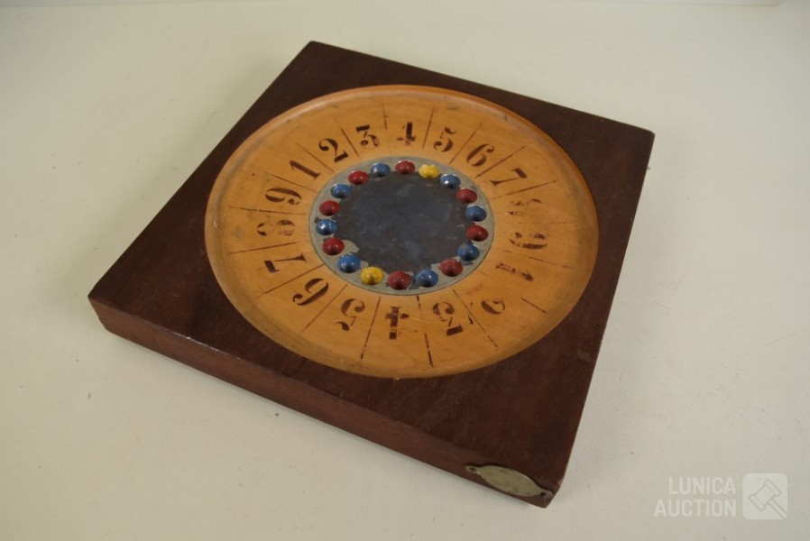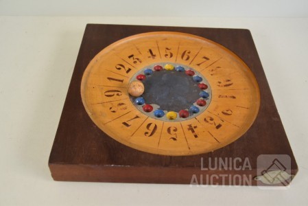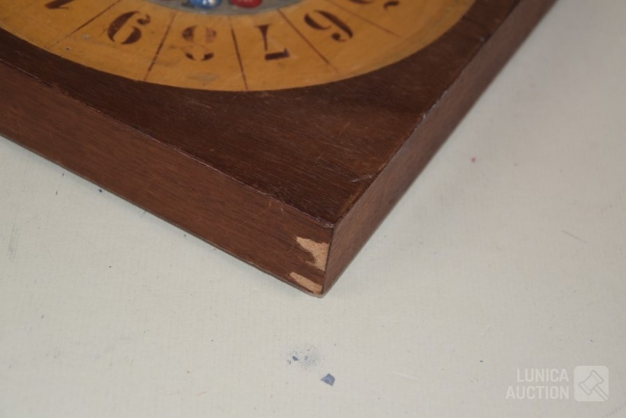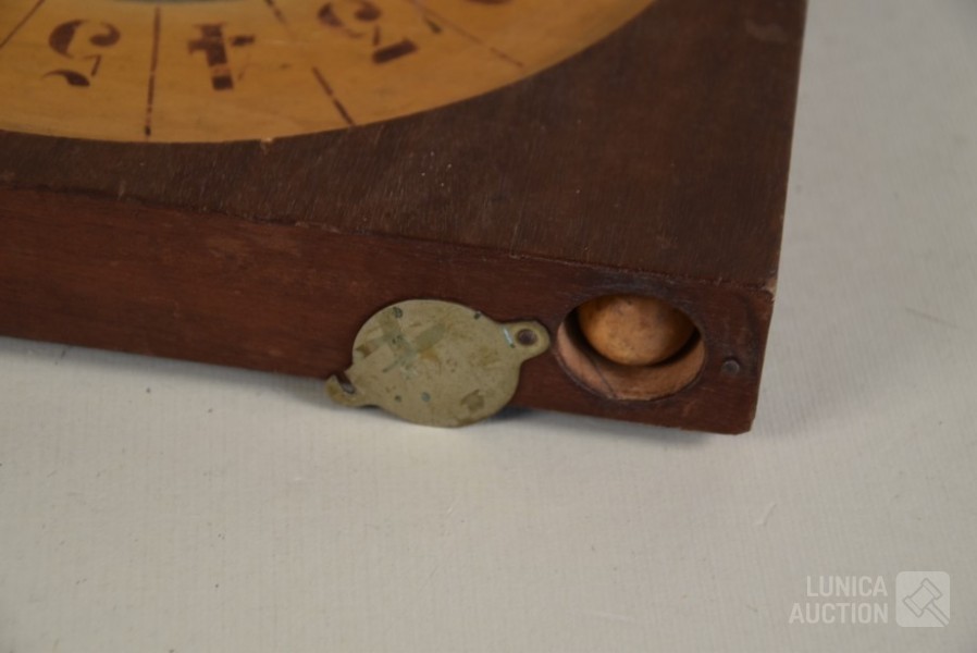 Jaren'30. Met houten balletje, zit verborgen in de zijkant. Genummerd roulettewiel met dubbele reeks nummers van 1 tot 9. Houten stempel en nummer op de onderzijde. Spel heeft nummer 3955. Met gebruikerssporen. Afmeting (bxdxh) 30x30x4 cm.