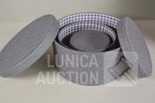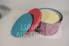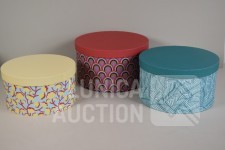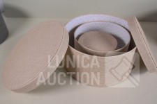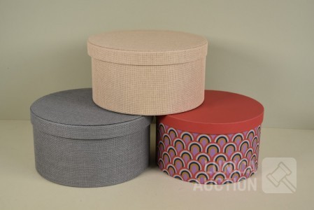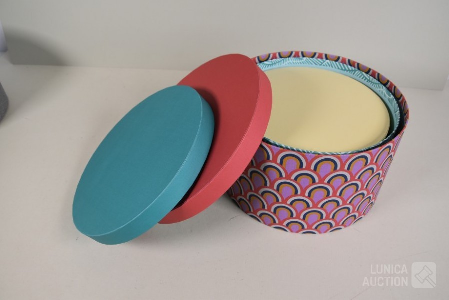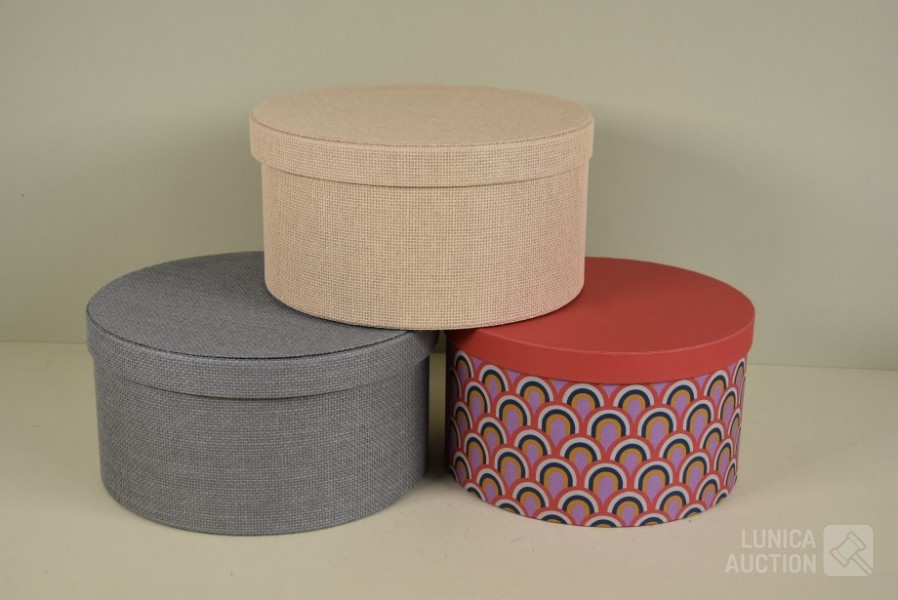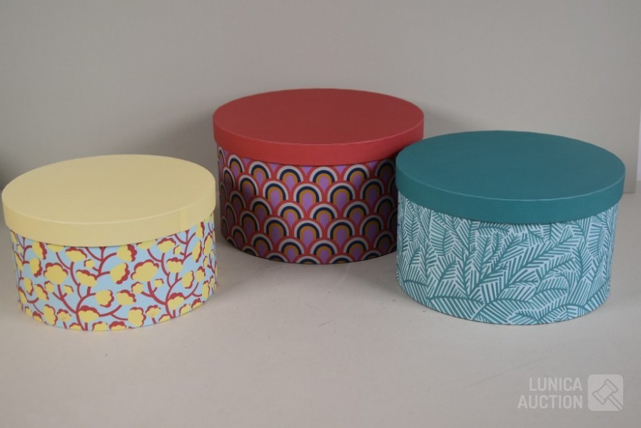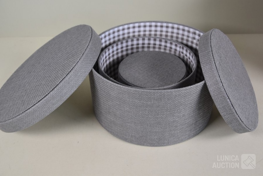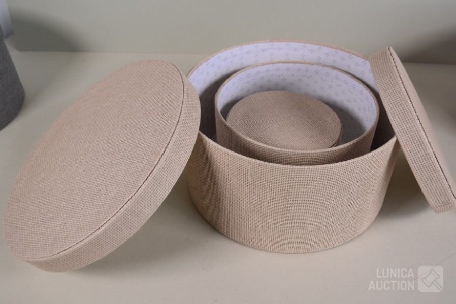Doorsnede van de grootste doos is 2x 29 cm en 1x 26 cm. Andere dozen zijn kleiner. Diverse materialen.