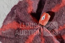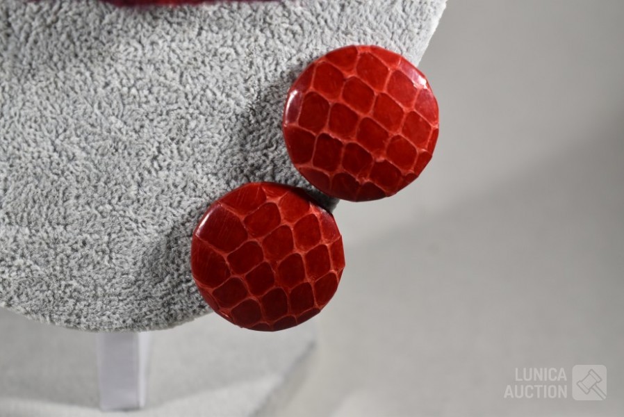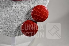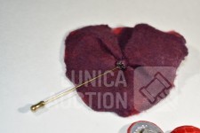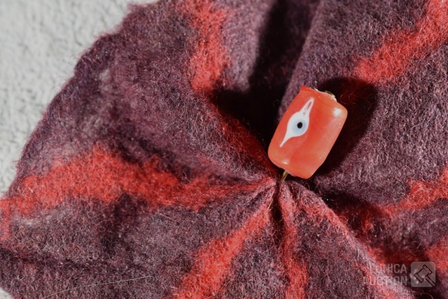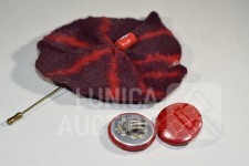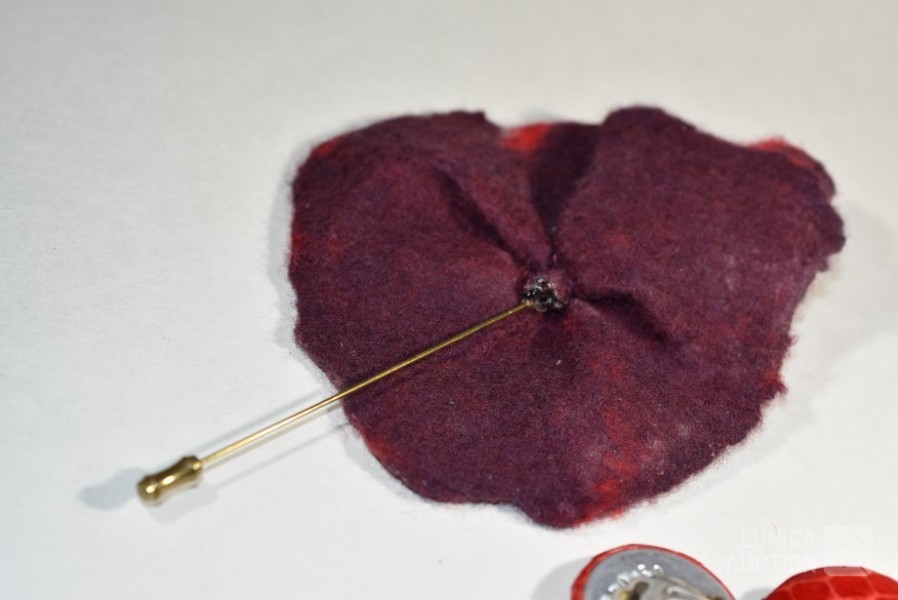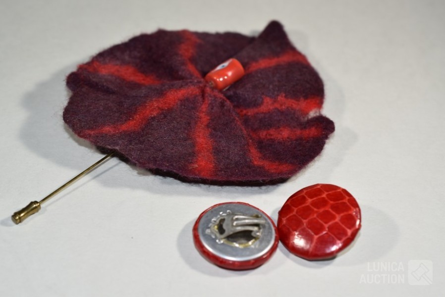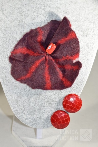 "broche"gemaakt van vilt, ca. 12x10 cm met lange sierspeld; Oorclips, doorsnede 3 cm, gemaakt van rood leder.