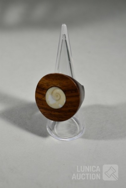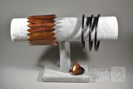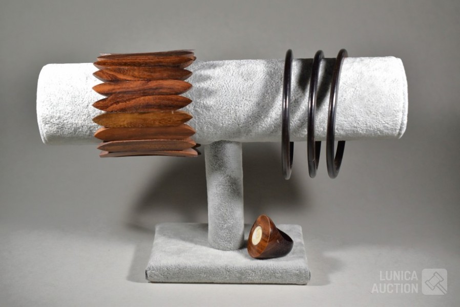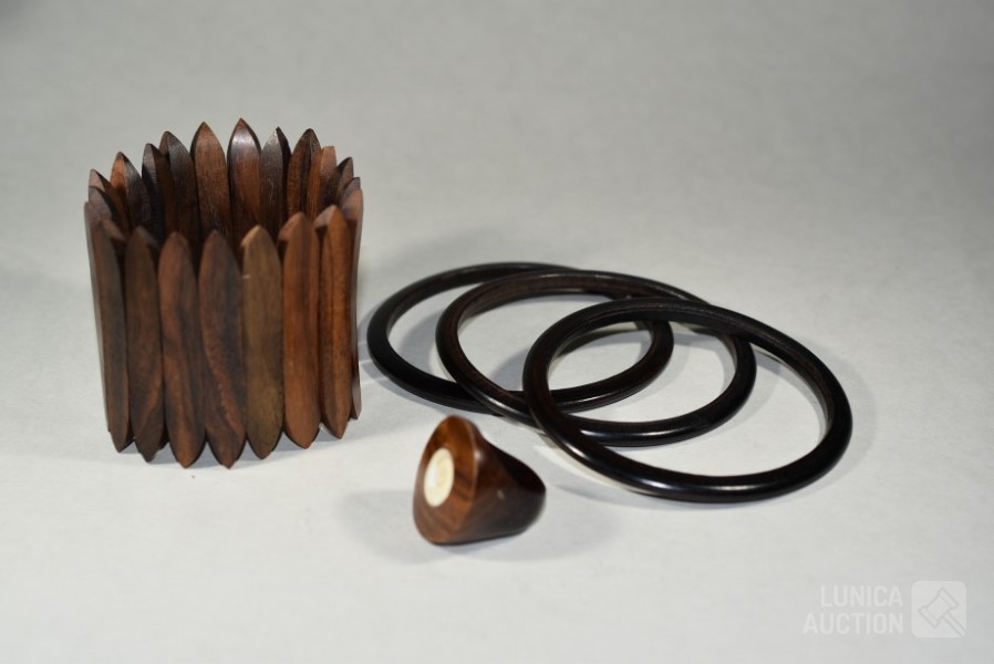 O.a. rekbare brede houten armband, breedte 6 cm; ring, met inzet van been, doorsnede 3 cm, ringdiameter 19 mm, mahoniehout; 3 ringarmbanden, doorsnede inwendig 7 cm, ebbenhout.