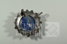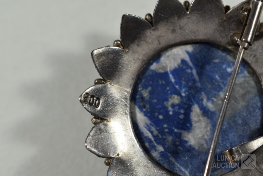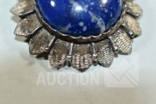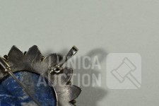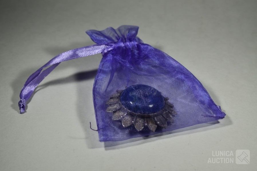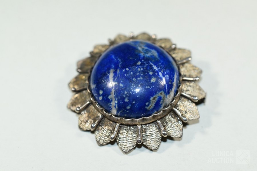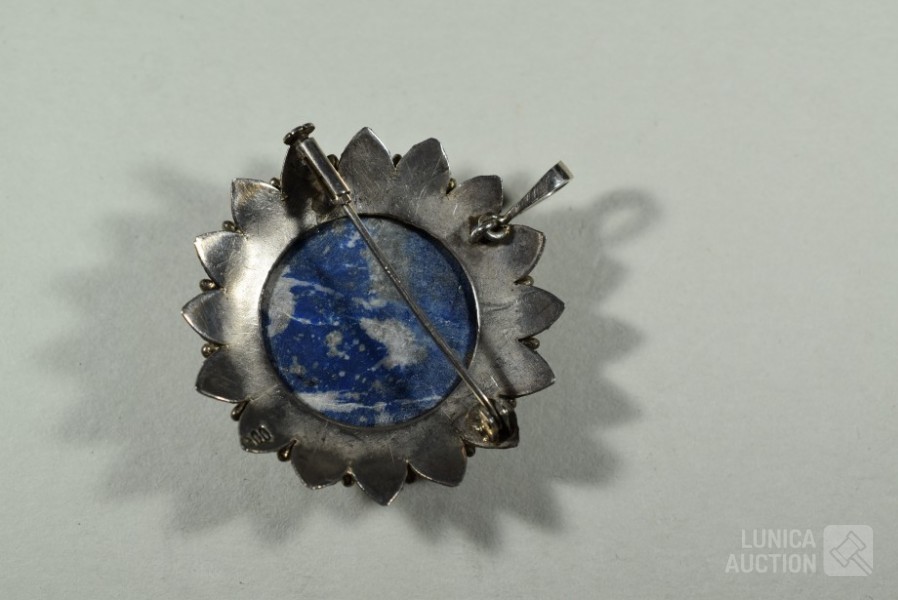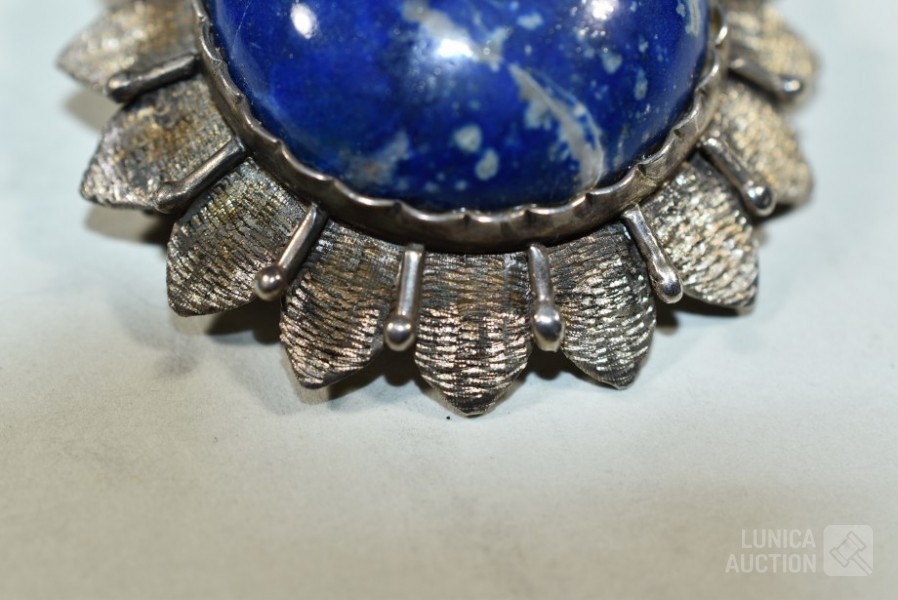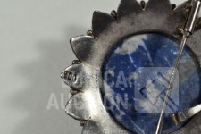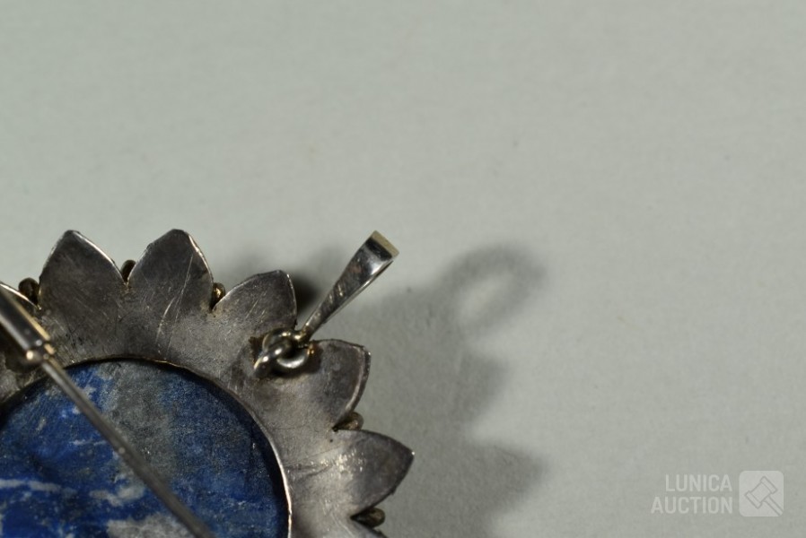 Inzet van sodaliet steen. Doorsnede 46 mm. Gewicht ca. 21 gram. Kan gebruikt worden als hanger of broche.