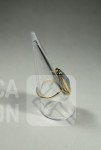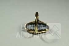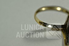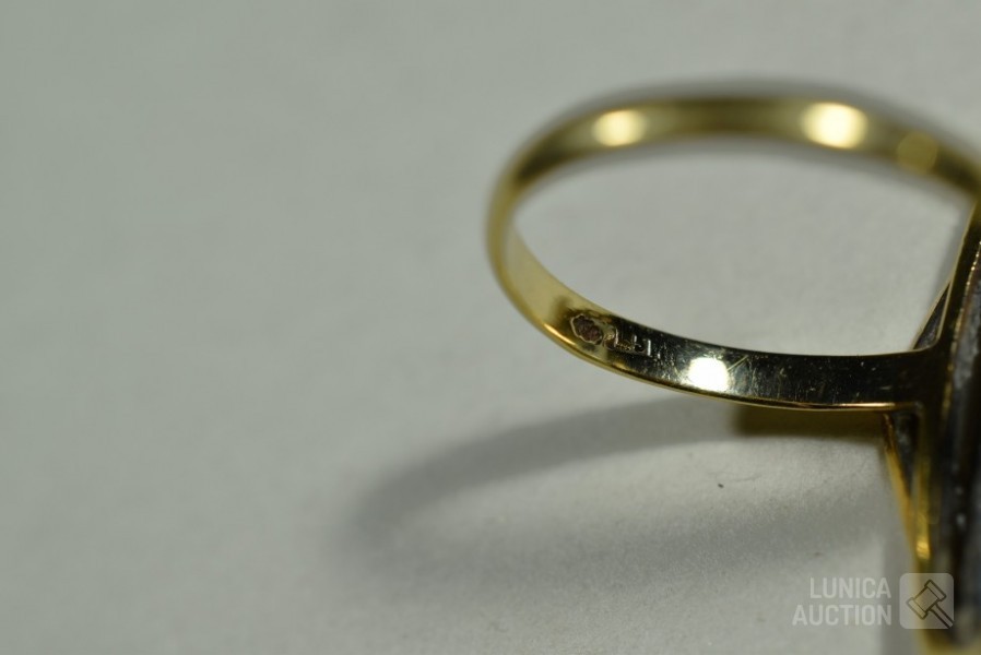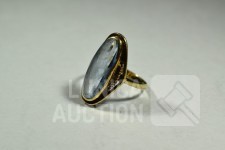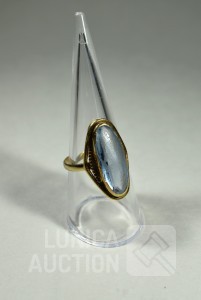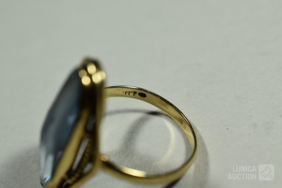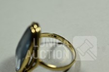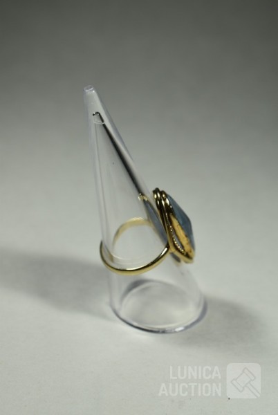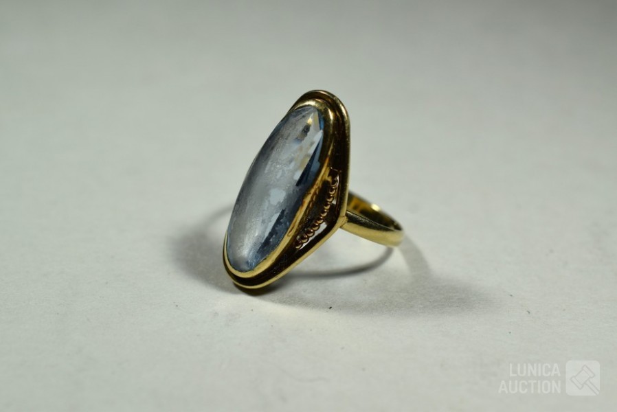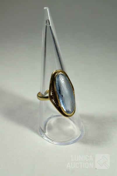 gemerkt met 585. Totaal gewicht ca. 4,8 gram. Ringmaat 17,5 mm. Aquamarijn is sleets.