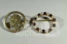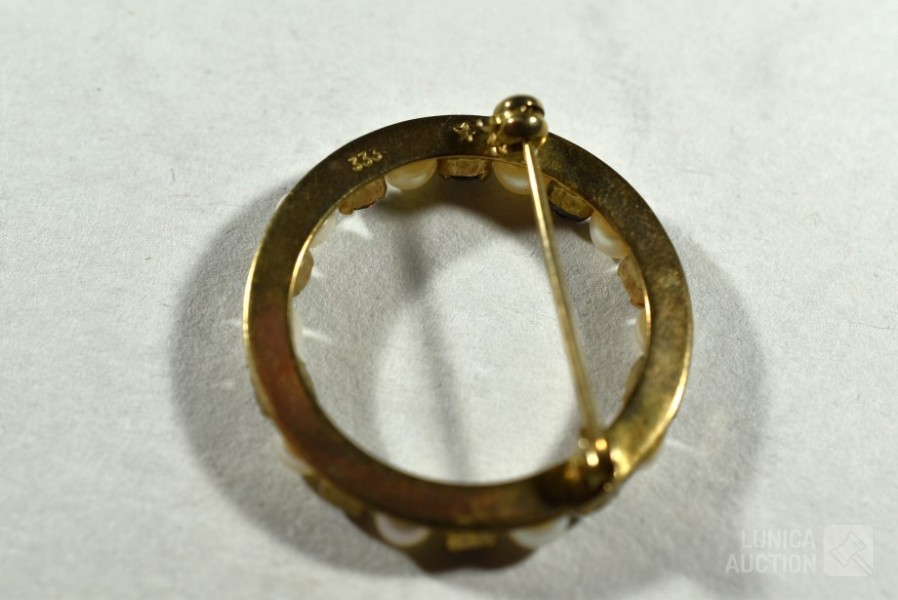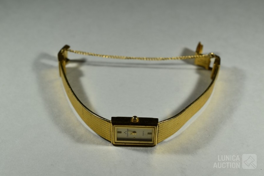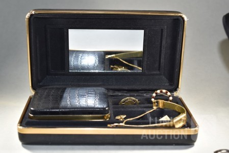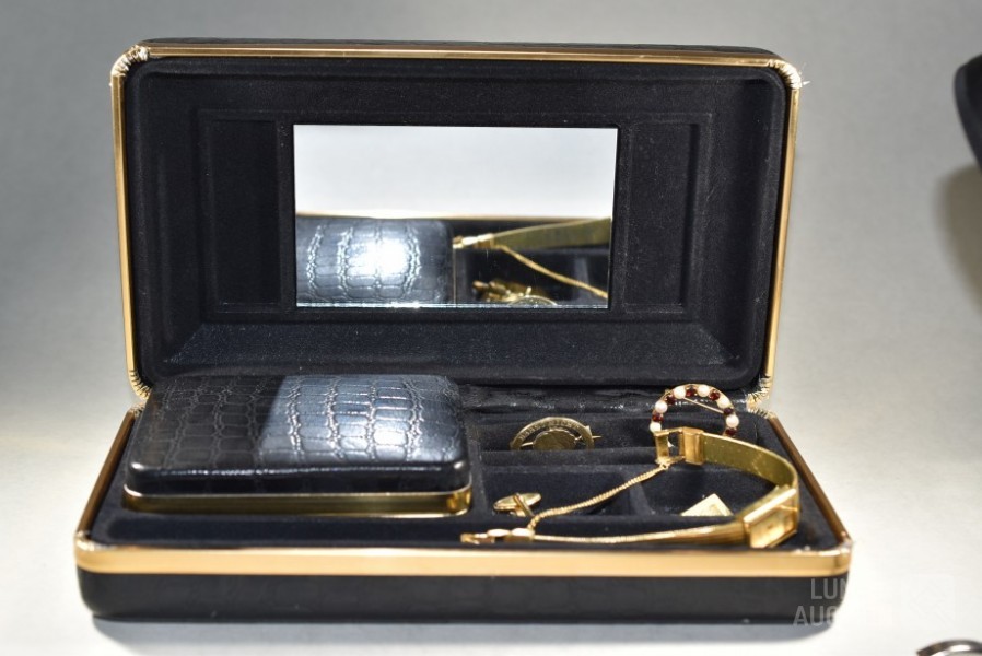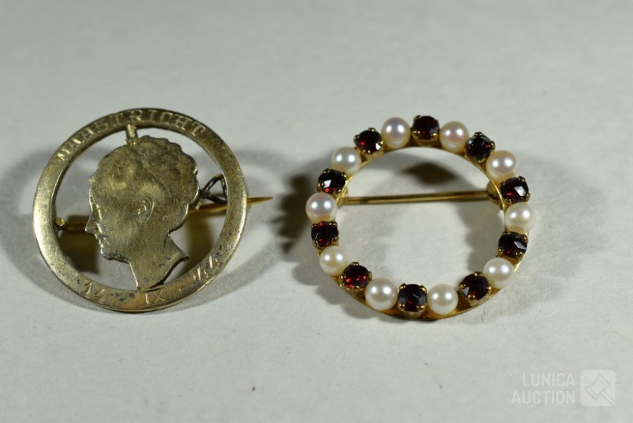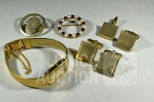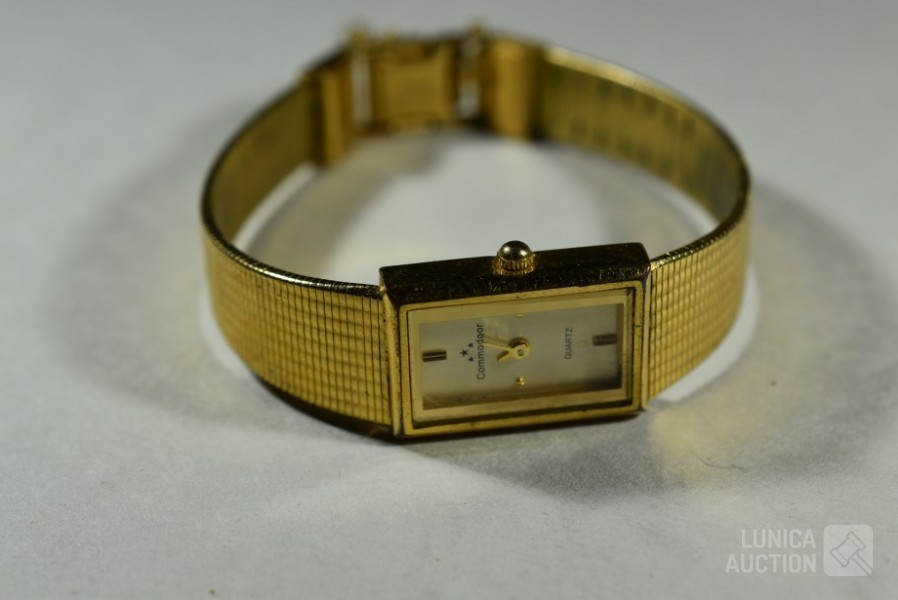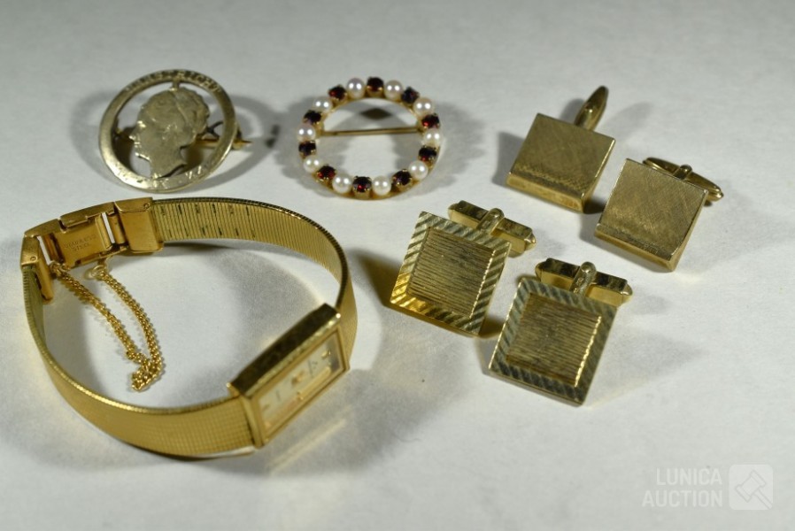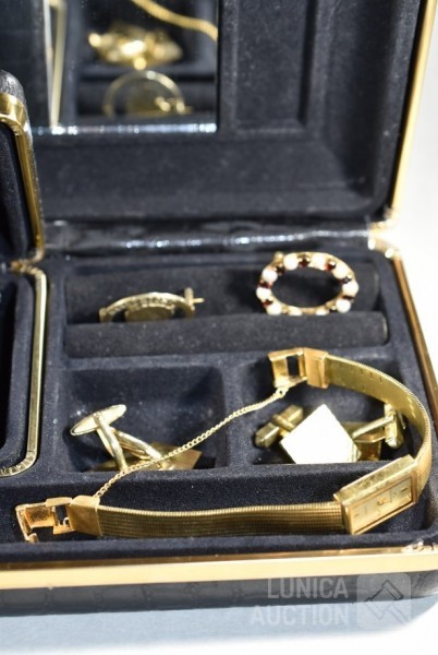 COMMODOOR dames quartzhorloge, 127-3940, stainless steel in goud kleur. Horloge staat stil; Cirkelbroche, goud 333, met inzet van parels en granaatsteen. Doorsnede broche 3 cm. Totaal gewicht ca. 4 gram. Gemerkt met 333; Set manchetknopen, goud 333, gemerkt met 333. Totaal gewicht ca. 9 gram; Set manchetknopen in goudkleur; Broche, "maastricht 14-09-1944", doorsnede 28 mm. Bevrijding Maastricht, gemaakt van zilveren munt (in goudkleur) met Wilhelmina in het midden. Mooie verzameling. Etui, afmeting ca. 22x12x6 cm.