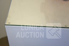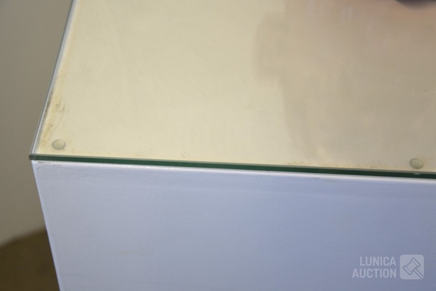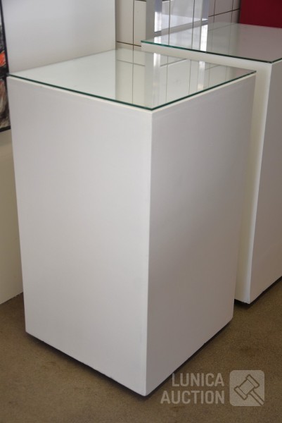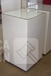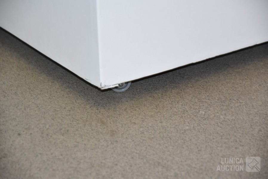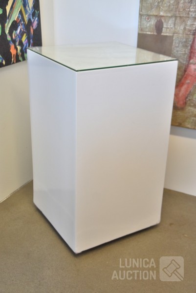 spaanplaat wit geschilderd, op wielen. Afmeting (bxdxh) 50x50x86 cm. Met lichte gebruikerssporen.
