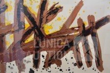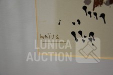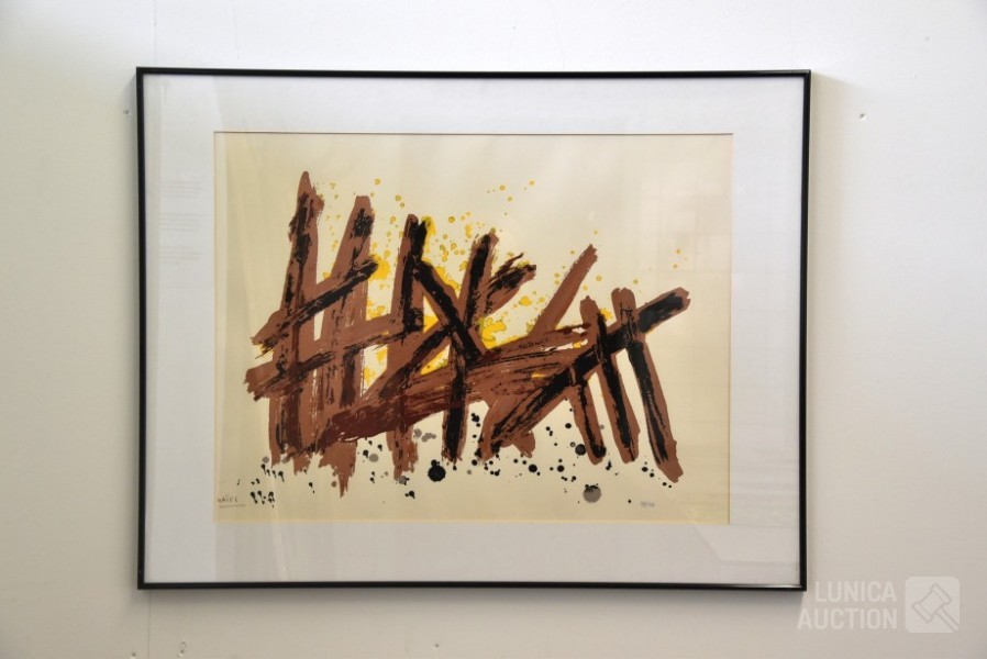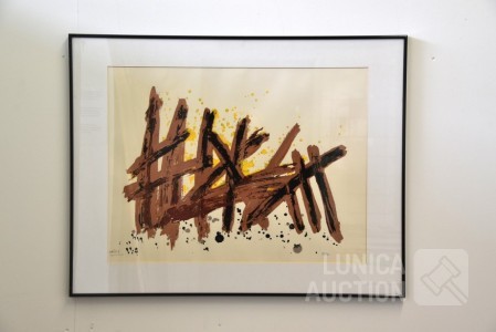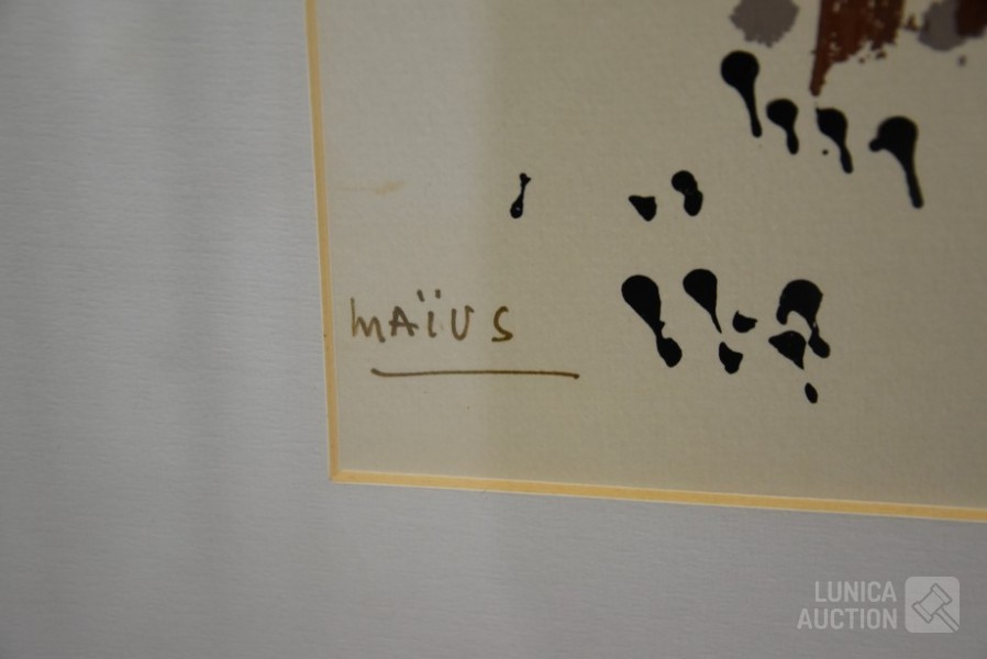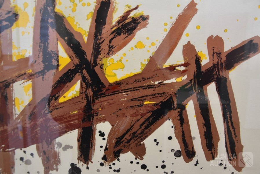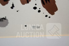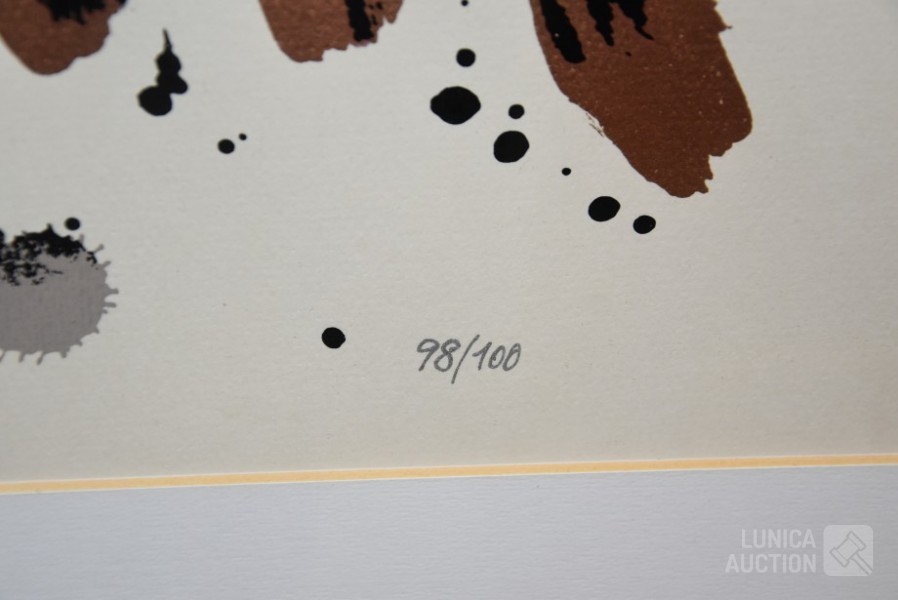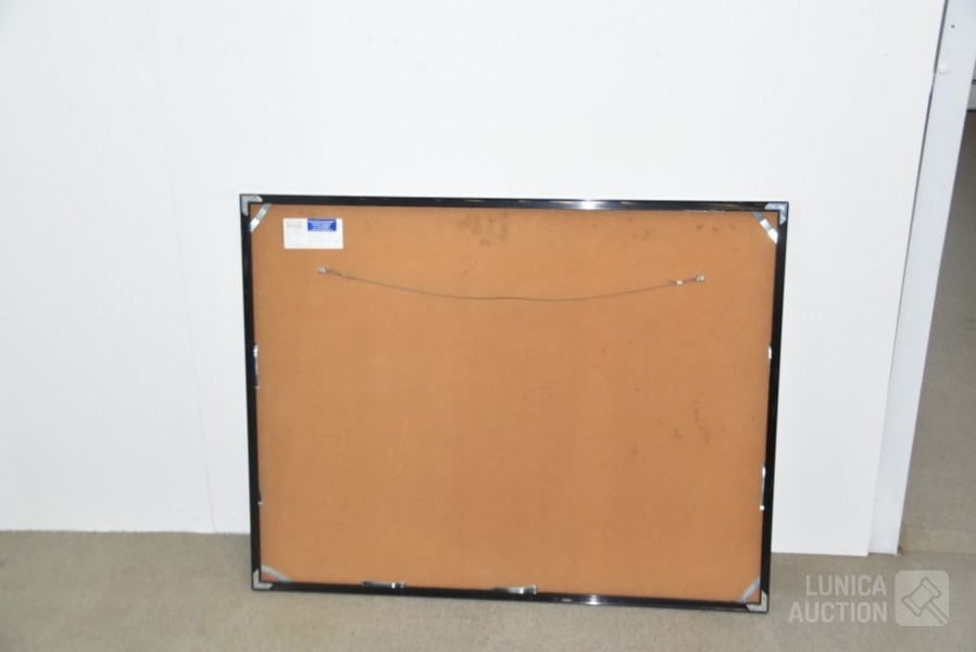 Zeefdruk op papier. Oplage 98/100. Ingelijst, achter glas. Afmeting 80x65 cm. Gesigneerd L.O.