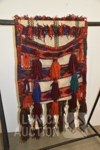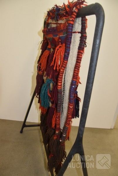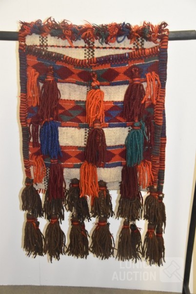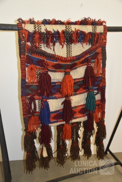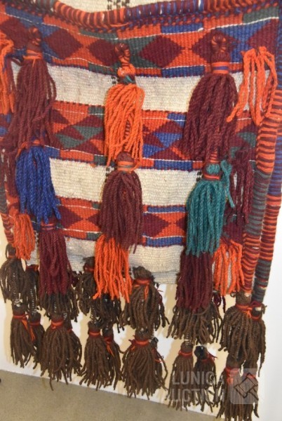 Originele zware Noord-Afrikaanse kamelenzadeltas met diepe zakken, versierd met kwastjes. Afmeting ca. 200x65 cm.