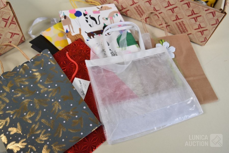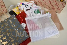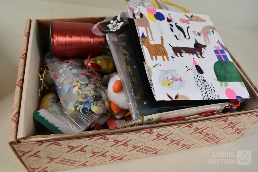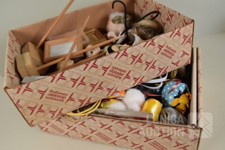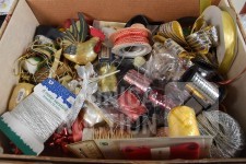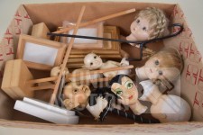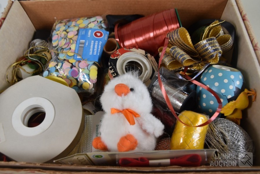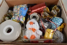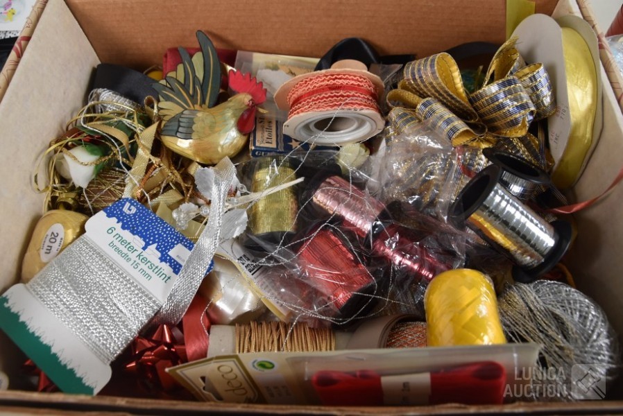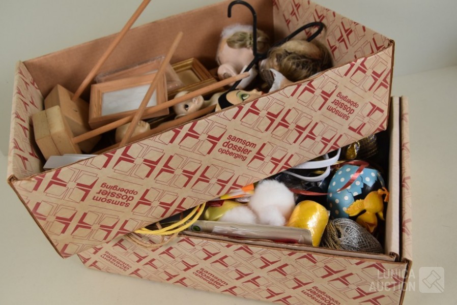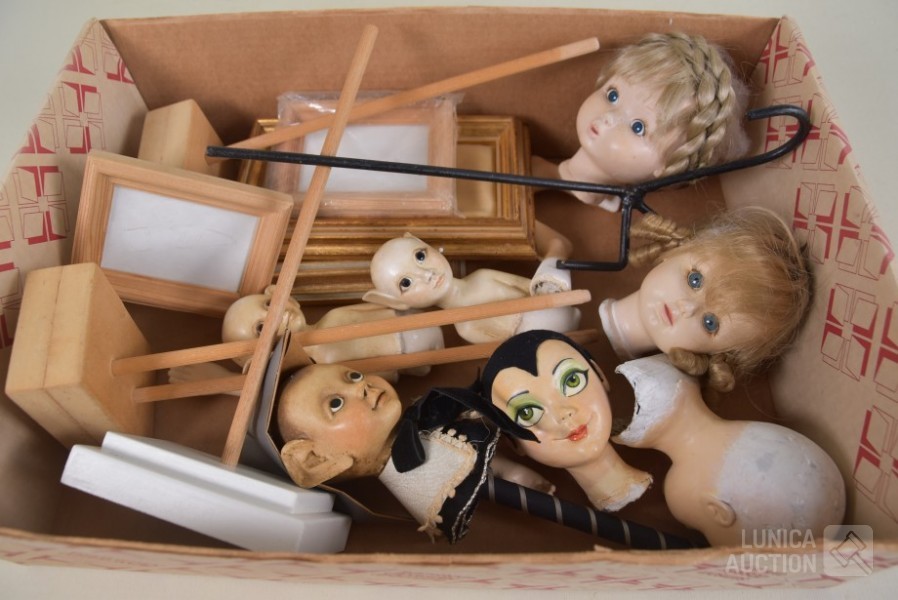 O.a. poppen hoofden, papier-maché hoofden, diverse rollen lint, glitters, papieren tassen enz.