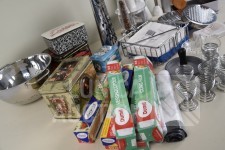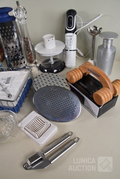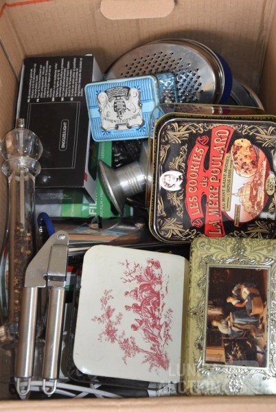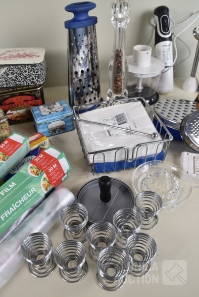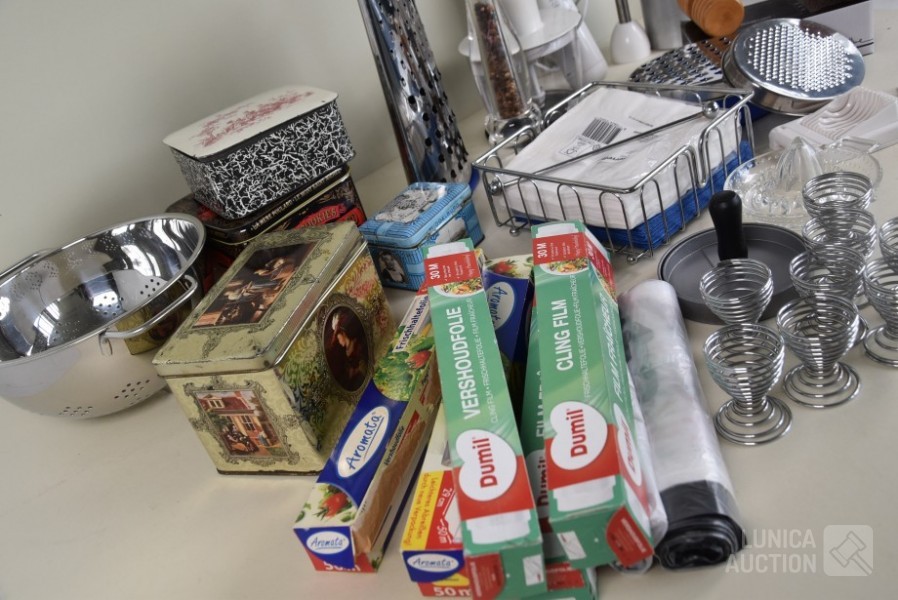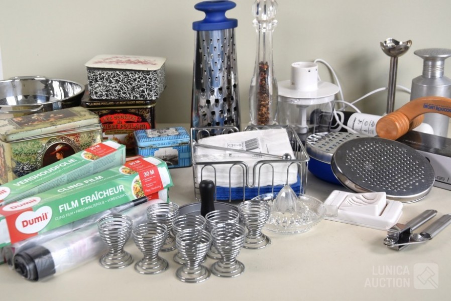O.a. vinatge blikken, wekkerradio, pepermolen, huishoudfolie, zoutbus, staafmixer, RVS eierdoppen, knoflookpers enz. Grote hoeveelheid. Totaal gewicht ca. 8 kg.