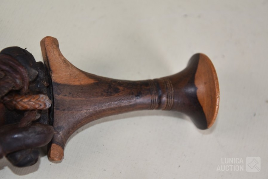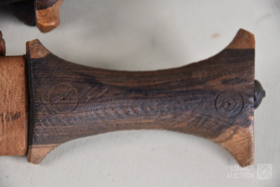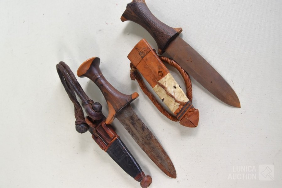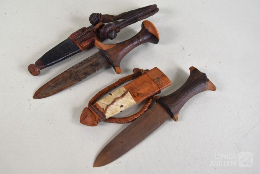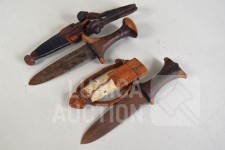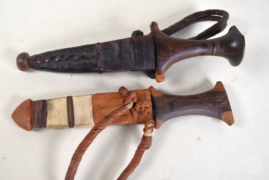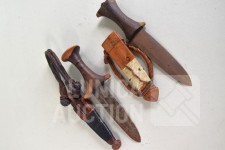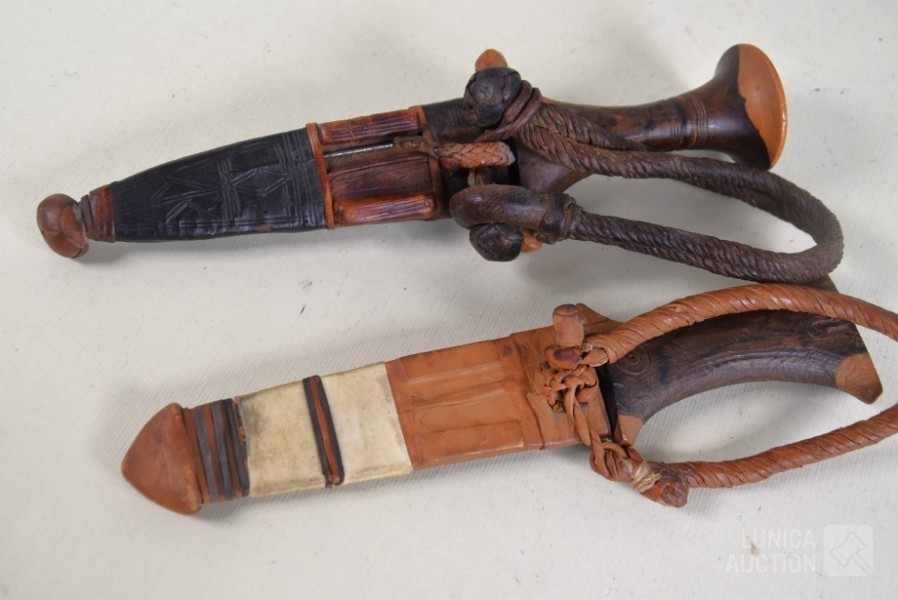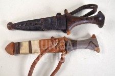 In lederen foedraal. Sudanese armdolken. Lengte 27 cm.