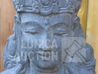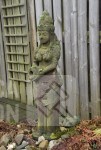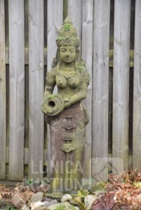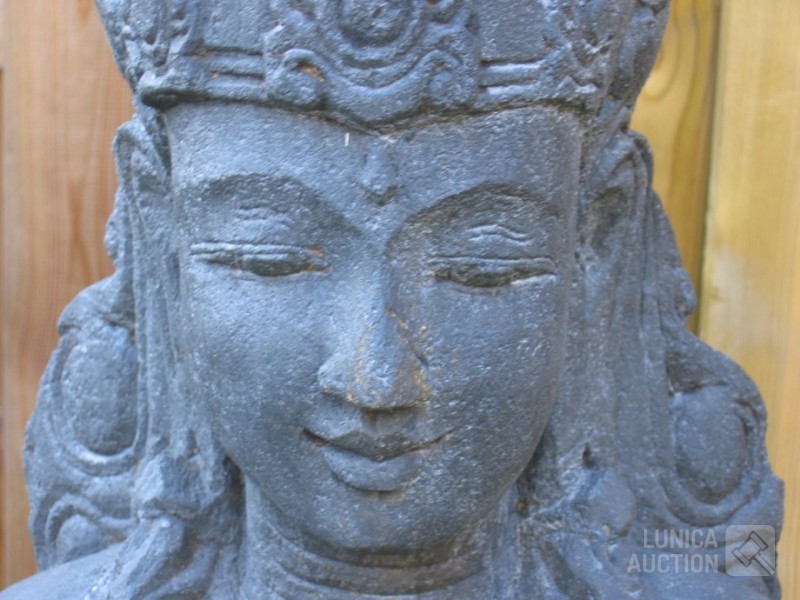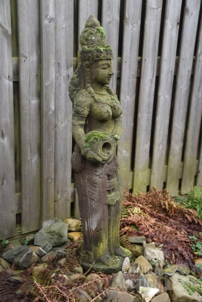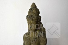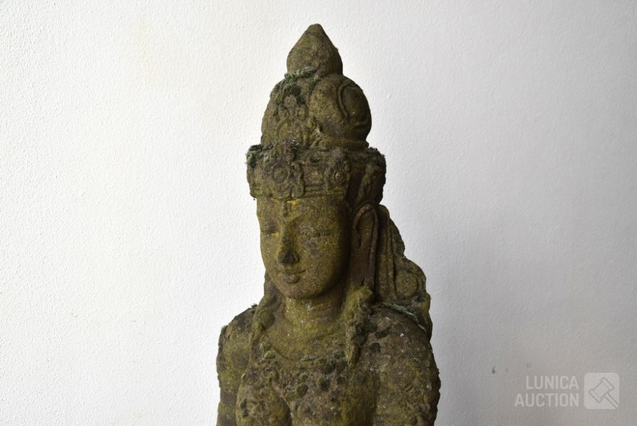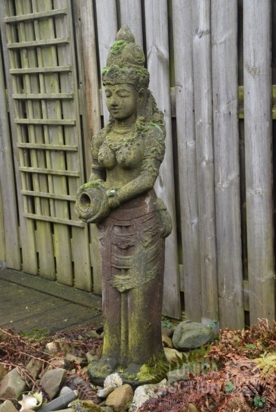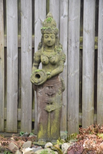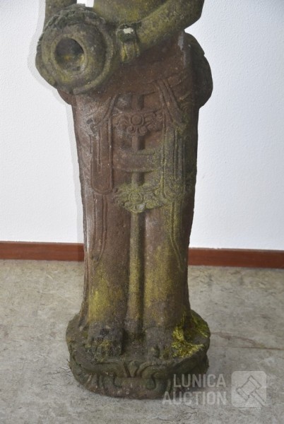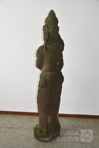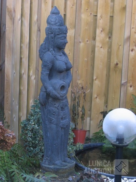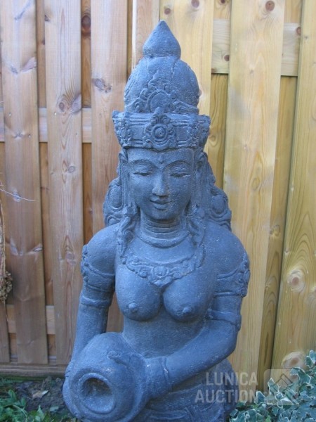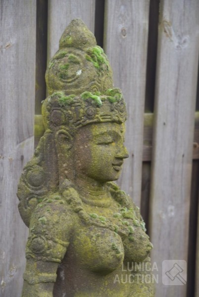 Afmeting (bxdxh) ca. 40x30x152 cm! Gewicht meer dan 150 kg. Indonesisch. Mooi tuinbeeld met natuurlijke verkleuring door weersinvloeden. De laatste 4 foto's zijn van het moment dat het beeld in de tuin is geplaatst, 25 jaar geleden.