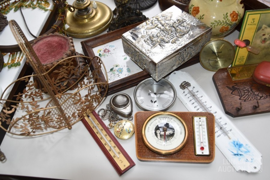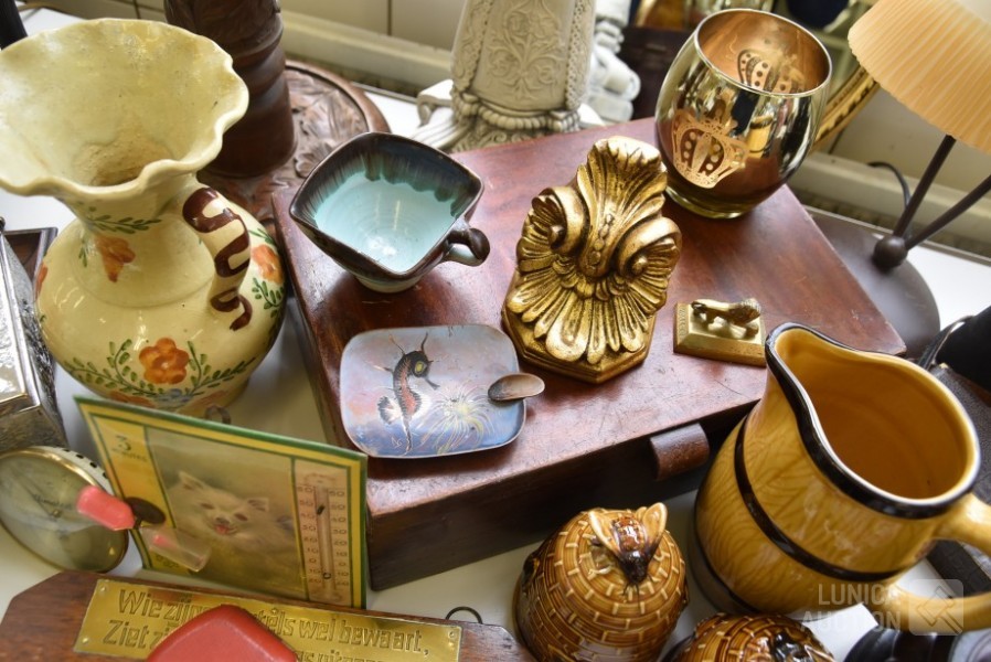 o.a. kandelaren, zakhorloge, verlichting, barometers, antiek dominospel, beelden, vazen, spiegel, oude strijkijzers en veel meer. Zie foto's. 4 dozen met inhoud. Deze kavel wordt niet verzonden per pakketdienst, uitsluitend ophalen.