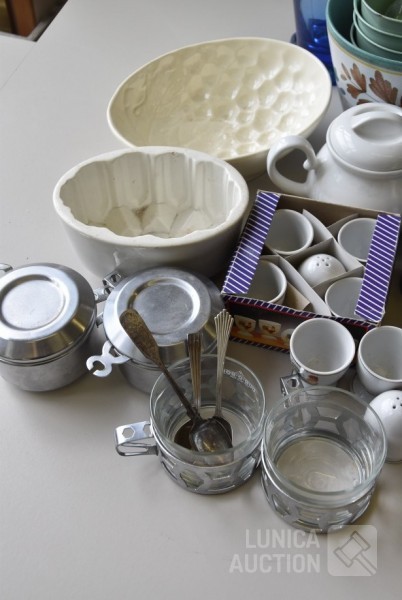 o.a. eierdoppen, servies, tin, vlaischotels, ROYAL ALBERT kop en schotels, vazen, puddingvormen en veel meer. Zie foto's. 3 dozen met inhoud. Deze kavel wordt niet verzonden per pakketdienst, uitsluitend ophalen.
