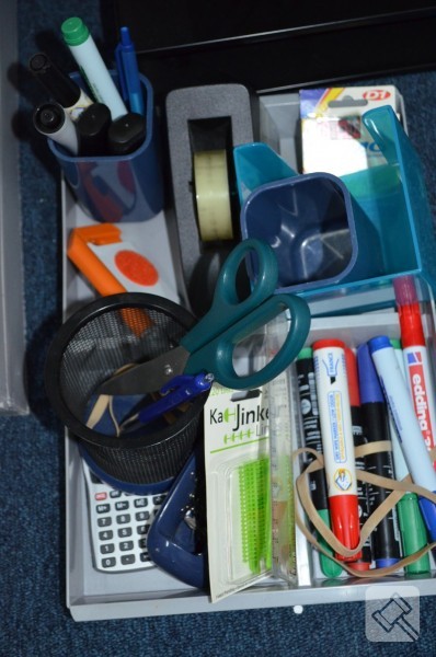 o.a. pennen, calculator, tape, postbak etc