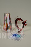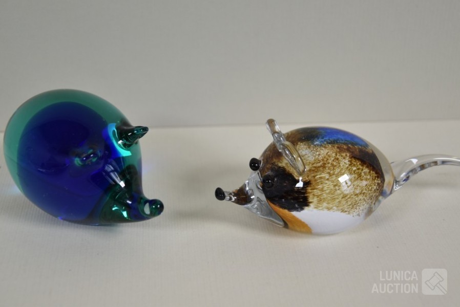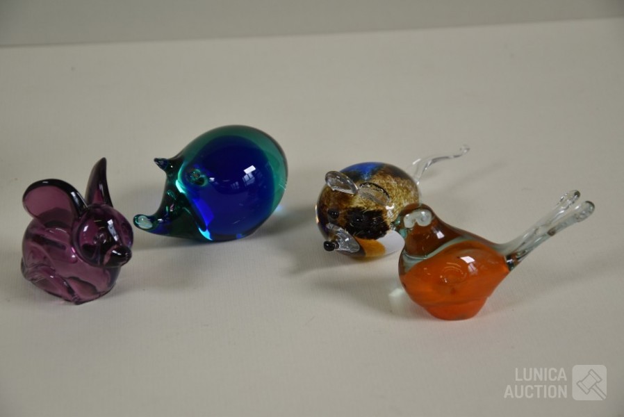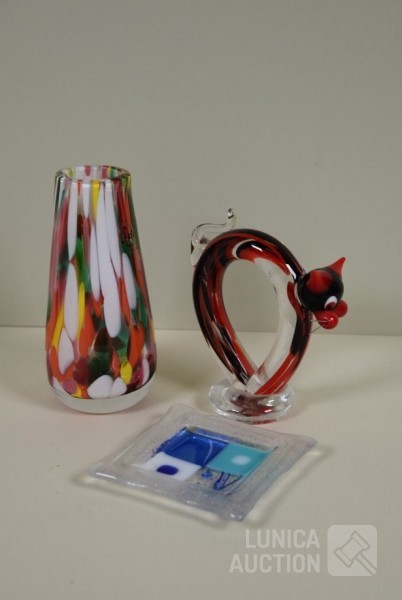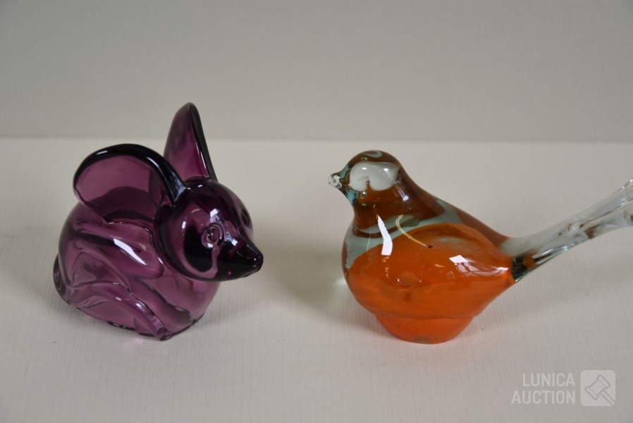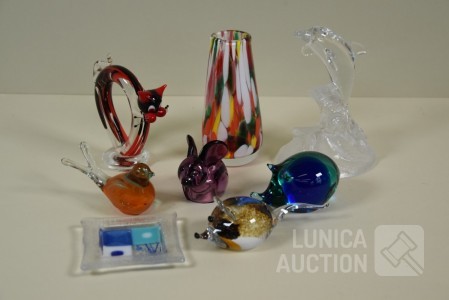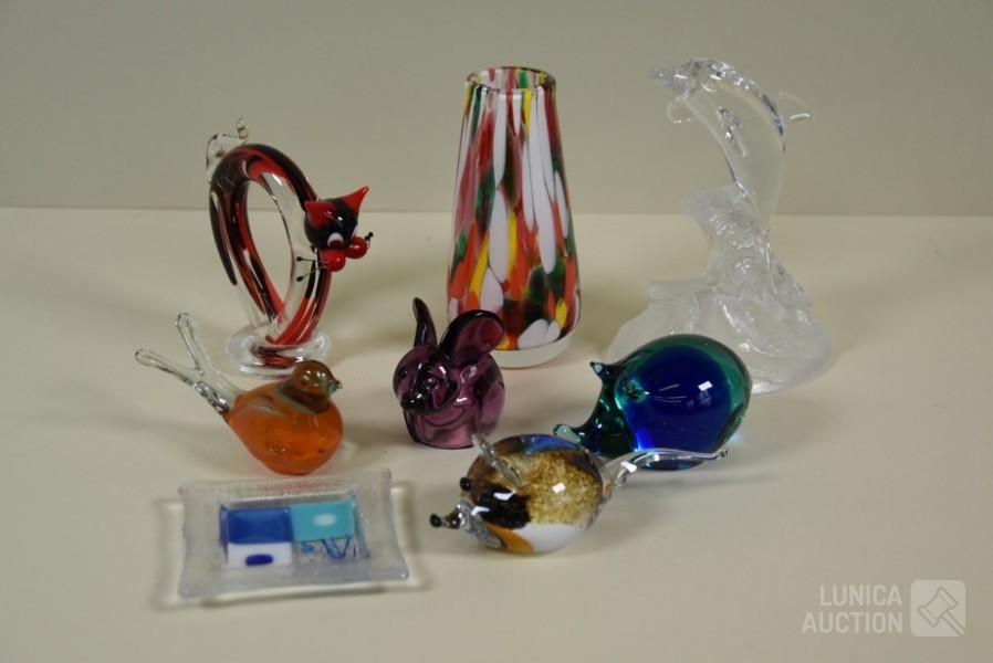 O.a. vaasje in meerkleurig glas, FIDRIO, hoogte 14 cm.; Muis, Cristallerie FERSTLER-FISCHER, lengte 14 cm; Dolfijn, hoogte 16 cm; Kat in meerkleurig glas, hoogte 12 cm; enz. Mooie verzameling
