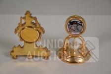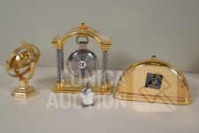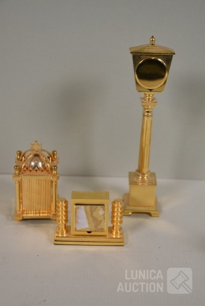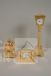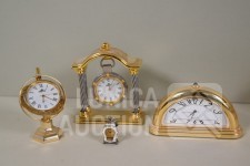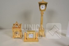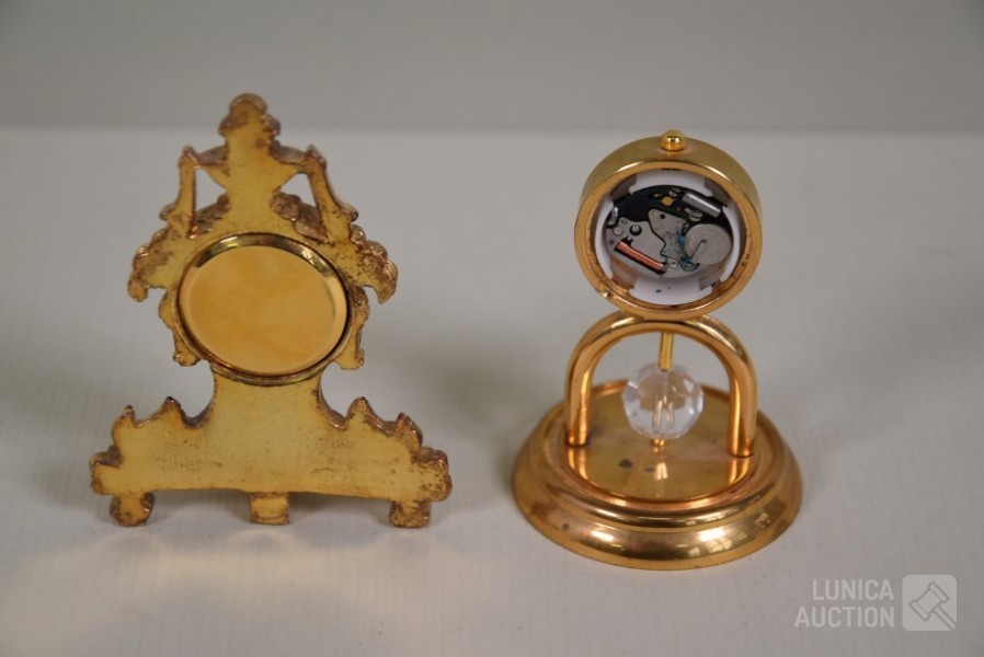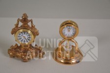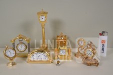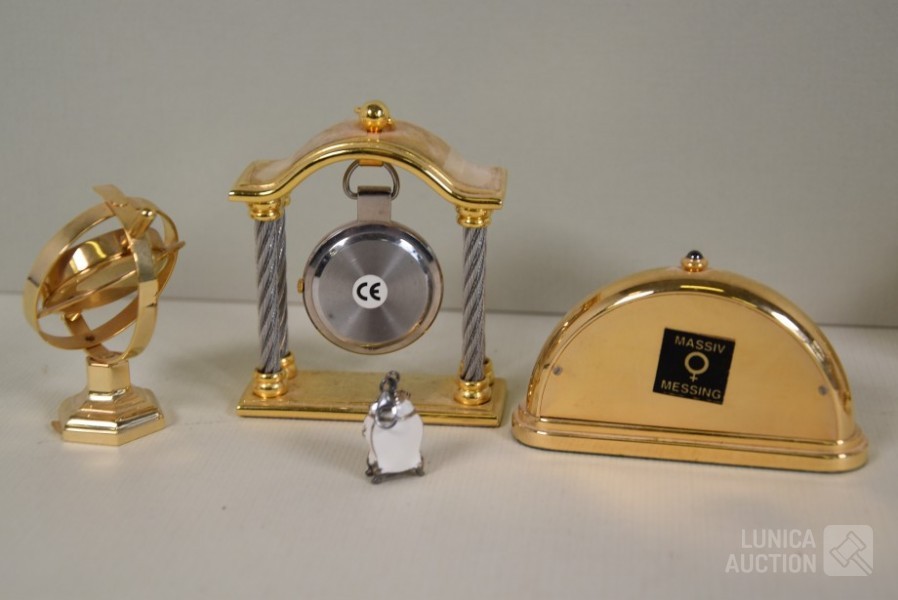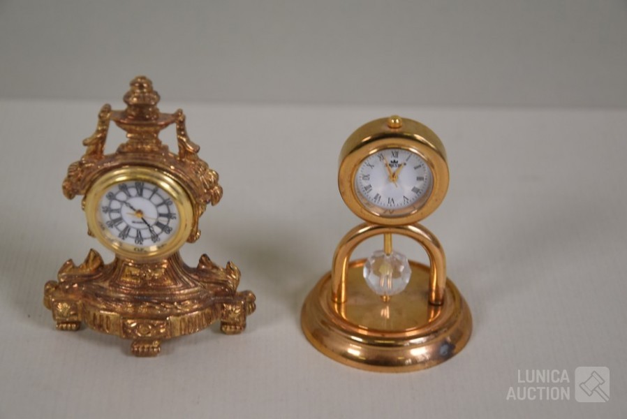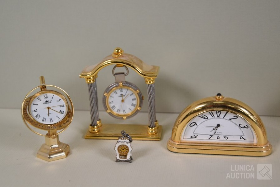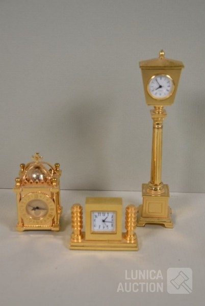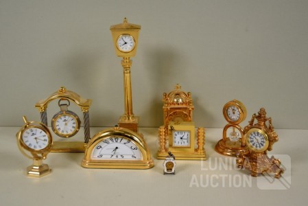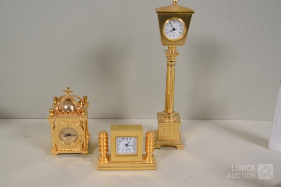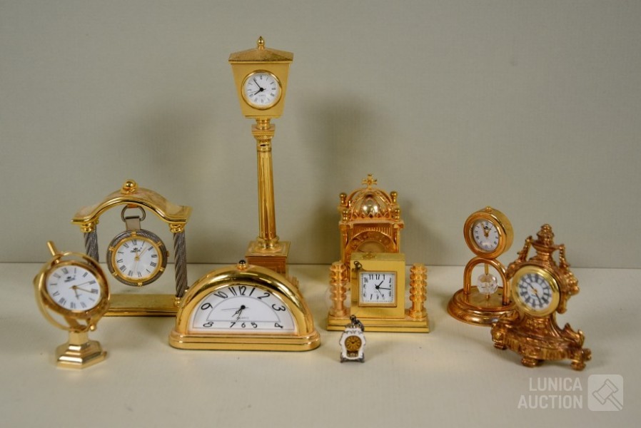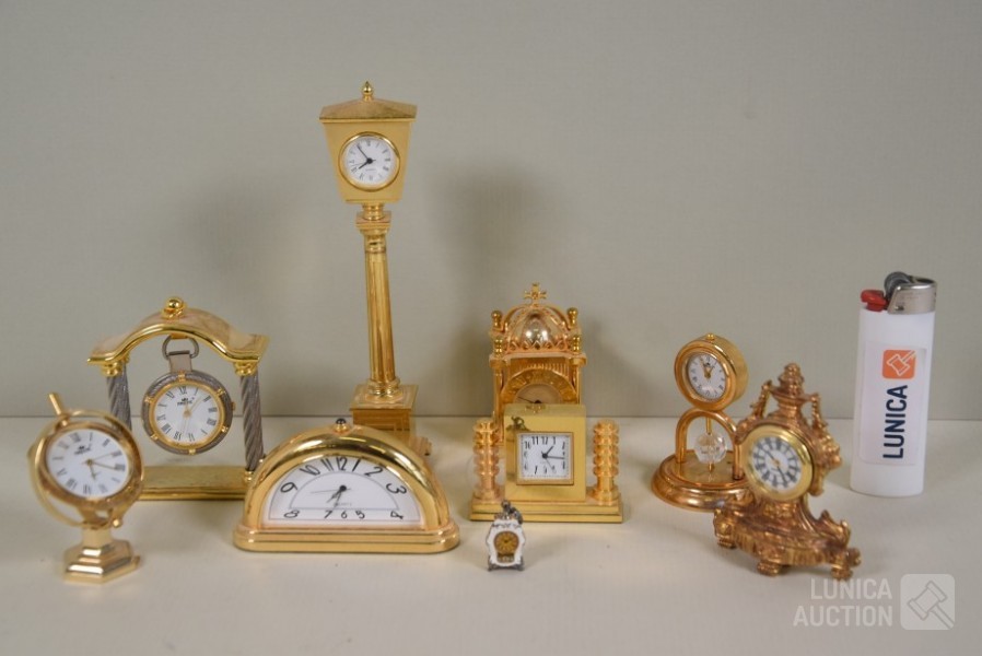 O.a. messing klokjes met quartz uurwerkjes, diverse modellen, o.a. zonnewijzer, lantaarnpaal, barokke klok enz; Merken: o.a. MAJESTIC. Hoogte variërend van 4 cm tot 14 cm. Klokjes staan stil, niet getest. Van één klokje ontbreekt beschermkapje batterij.