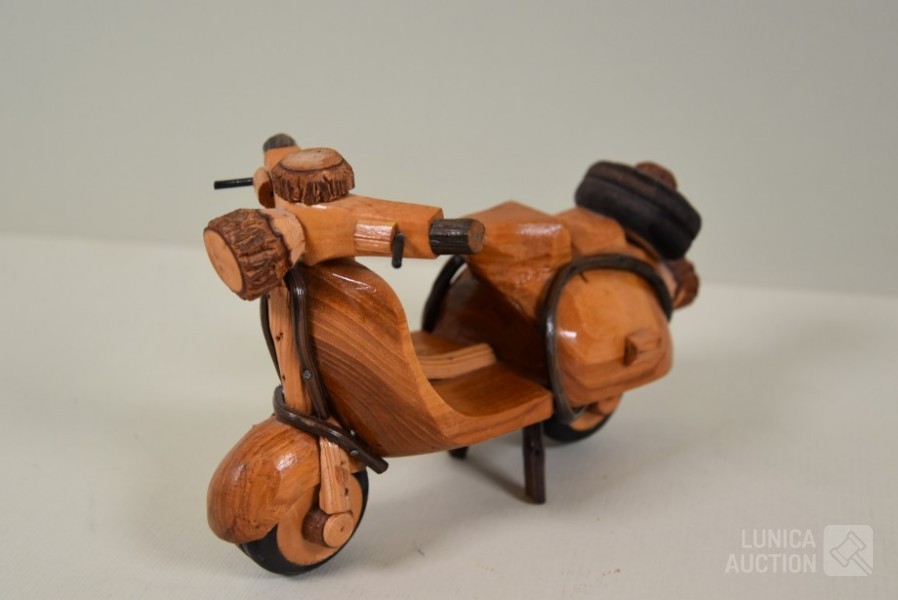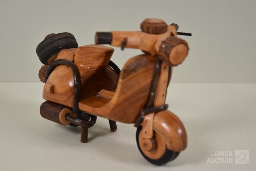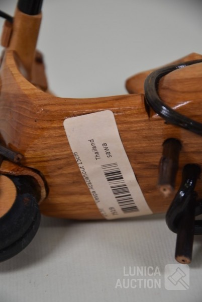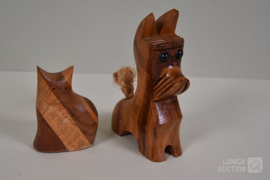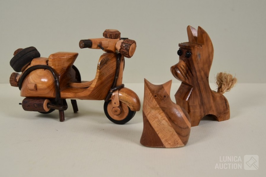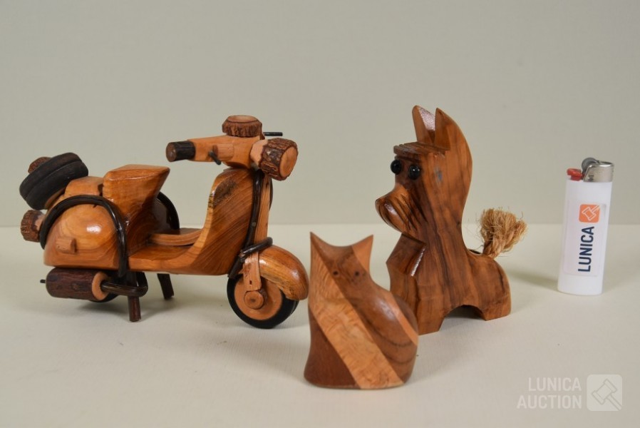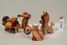 O.a. Hond, hoogte 11 cm; Kat, hoogte 7 cm; Scooter, acaciahout, thailand, afmeting (bxh) 17x11 cm.