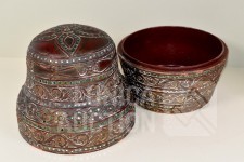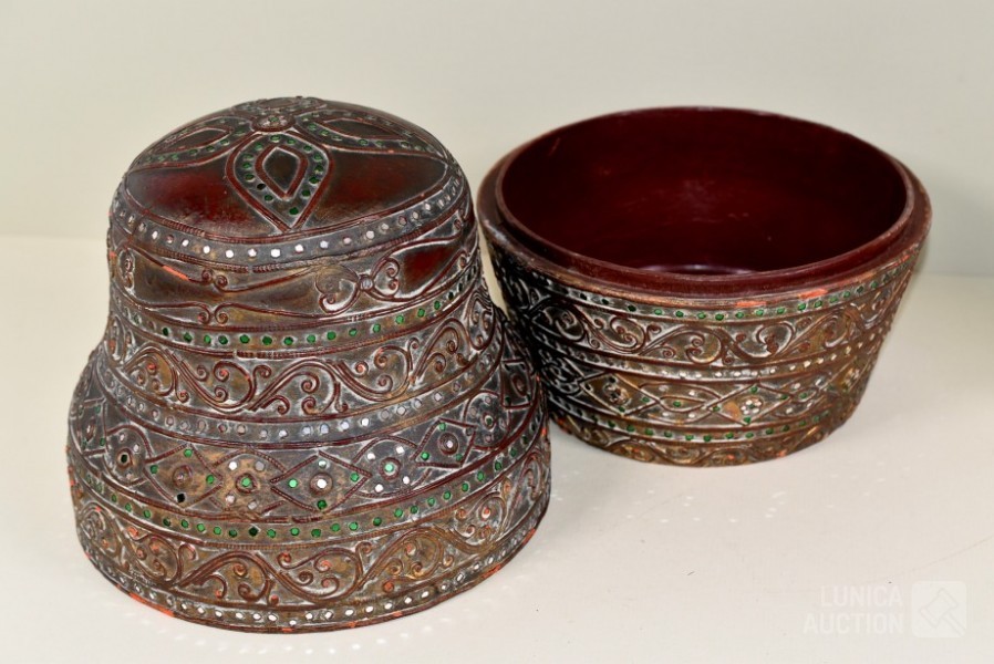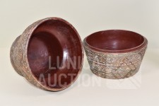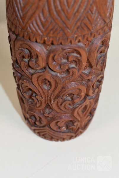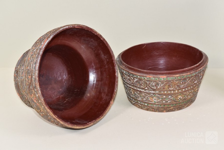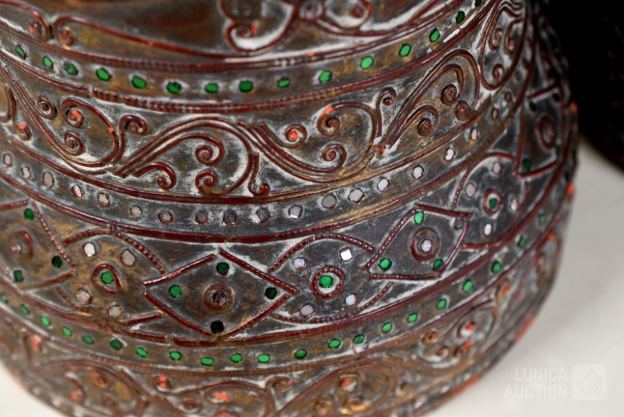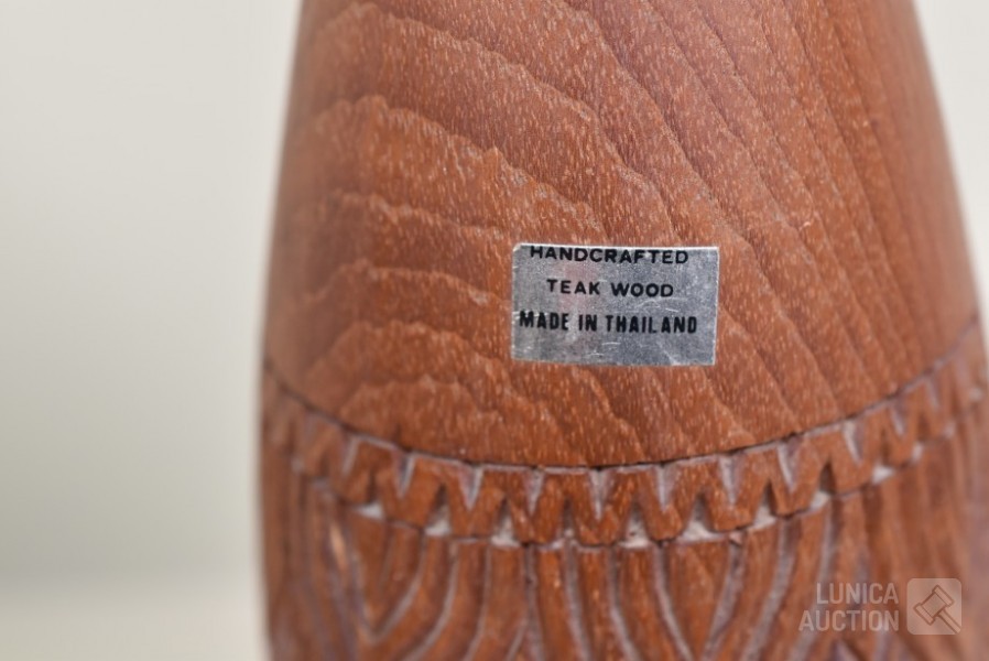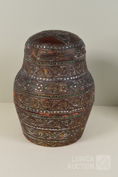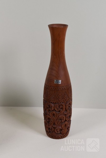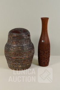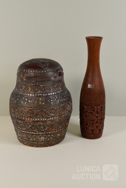 O.a. Vaas van houtsnijwerk, hoogte 38 cm; Dekselvaas, aardewerk, hoogte 32 cm, doorsnede 23 cm.