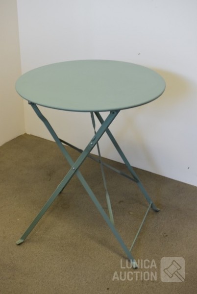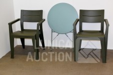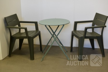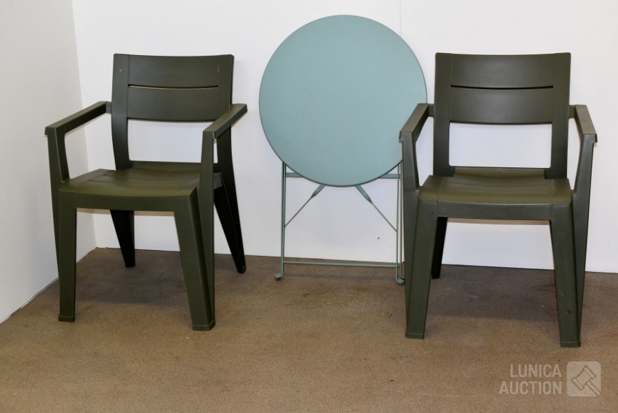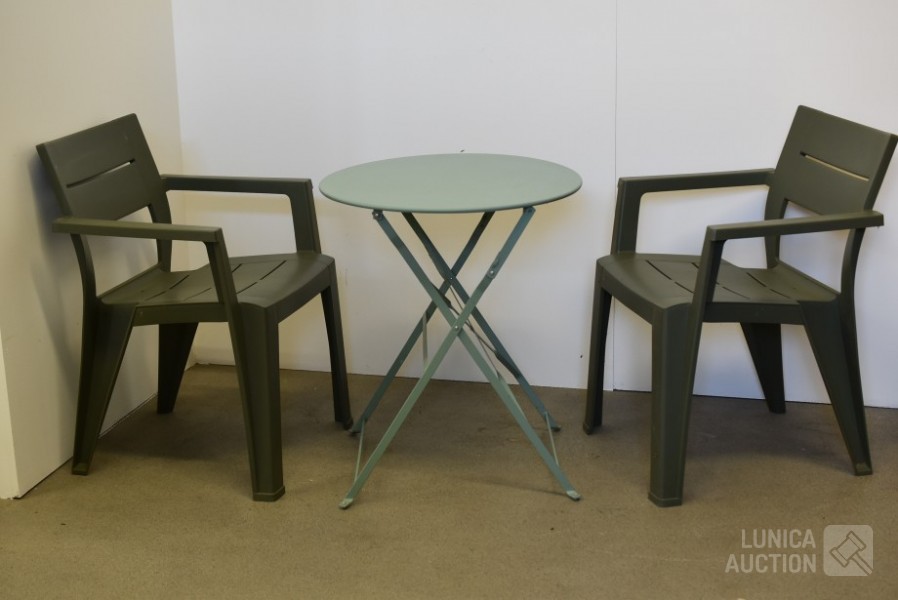 O.a. inklapbare bistrotafel, metaal,hoogte 70 cm, doorsnede 60 cm.; 2 kunststof, stapelbare stoelen, KETER, afmeting (bxdxh) 58x55x78 cm. Een schroefje van scharnier bistrotafel ontbreekt.