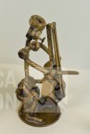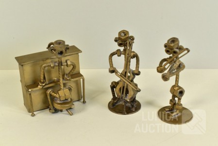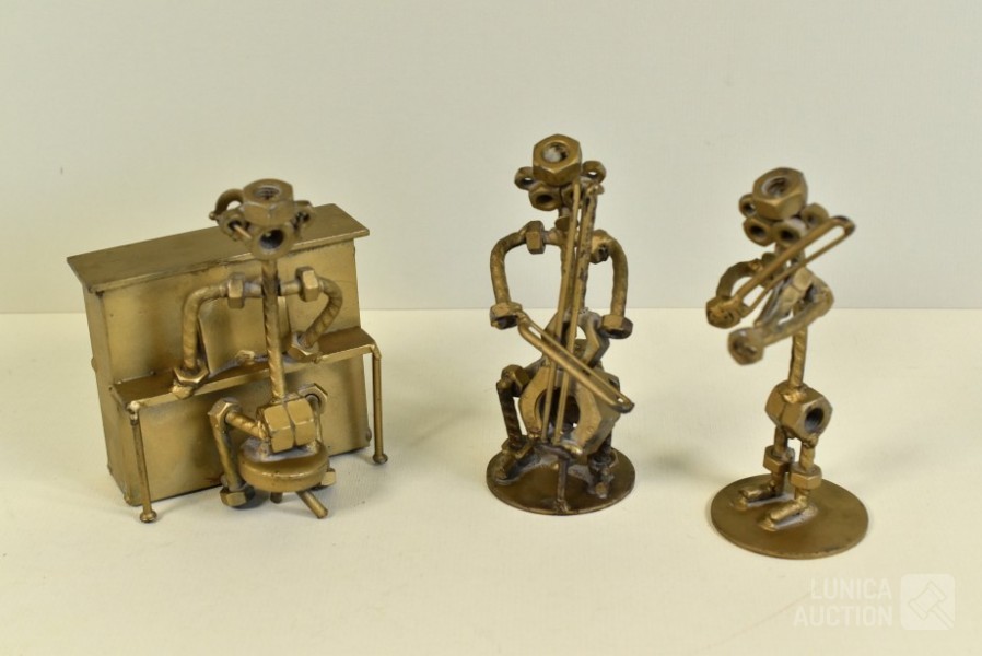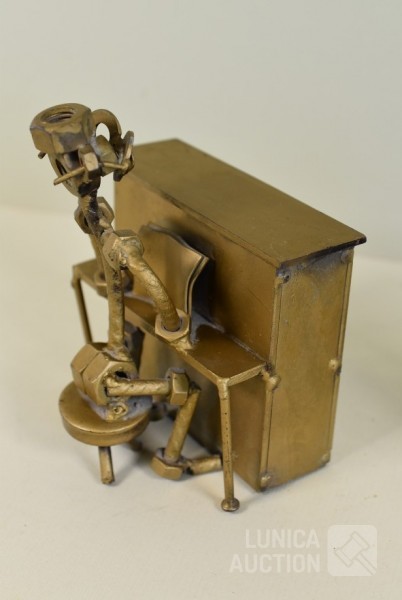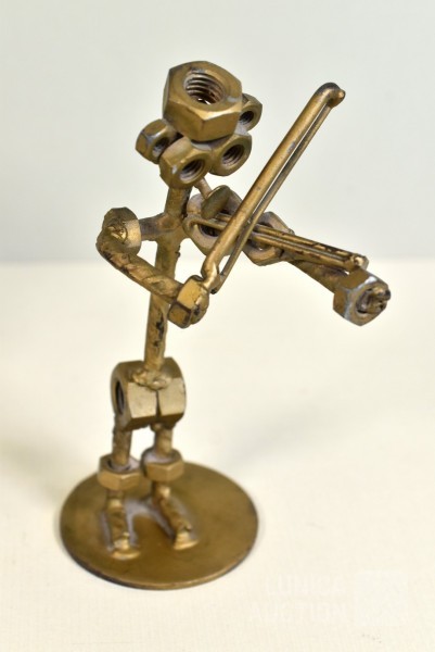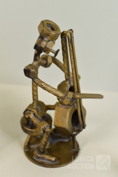 Gemaakt van bouten/draad/plaatijzer. In koperkleur. Hoogte ca. 16 cm.