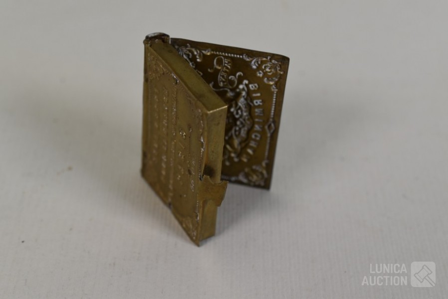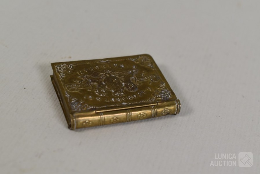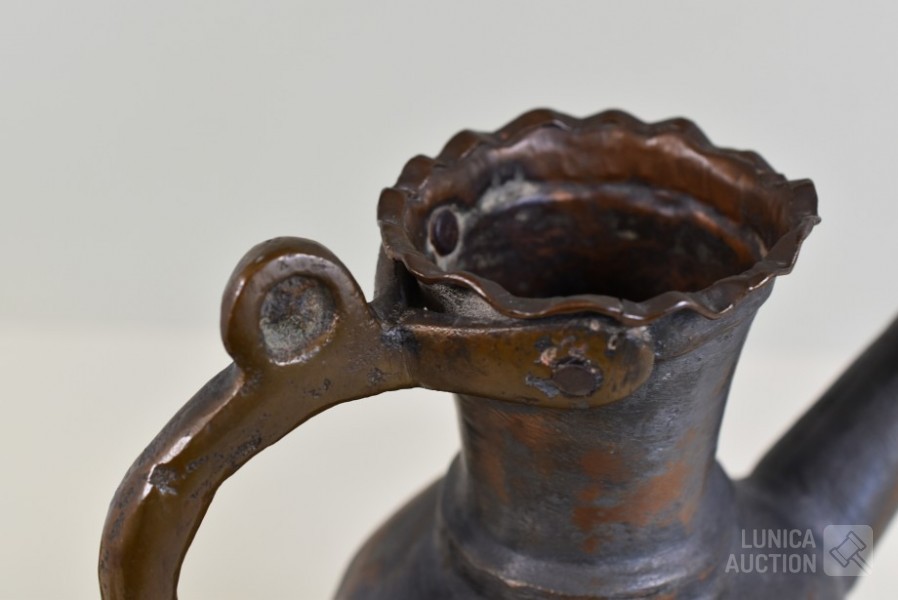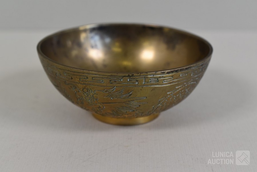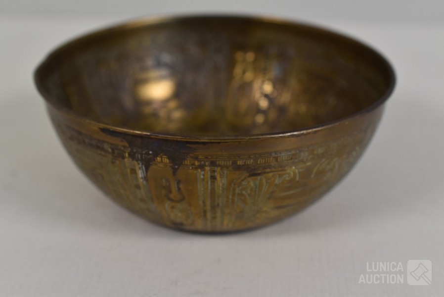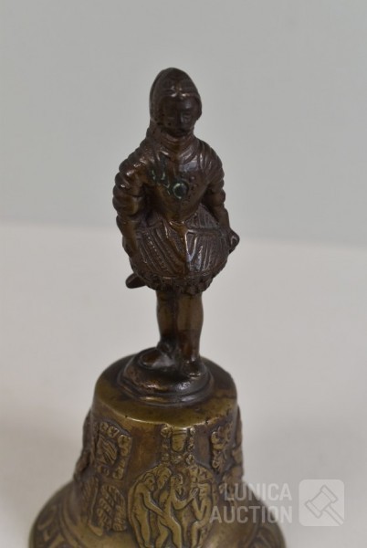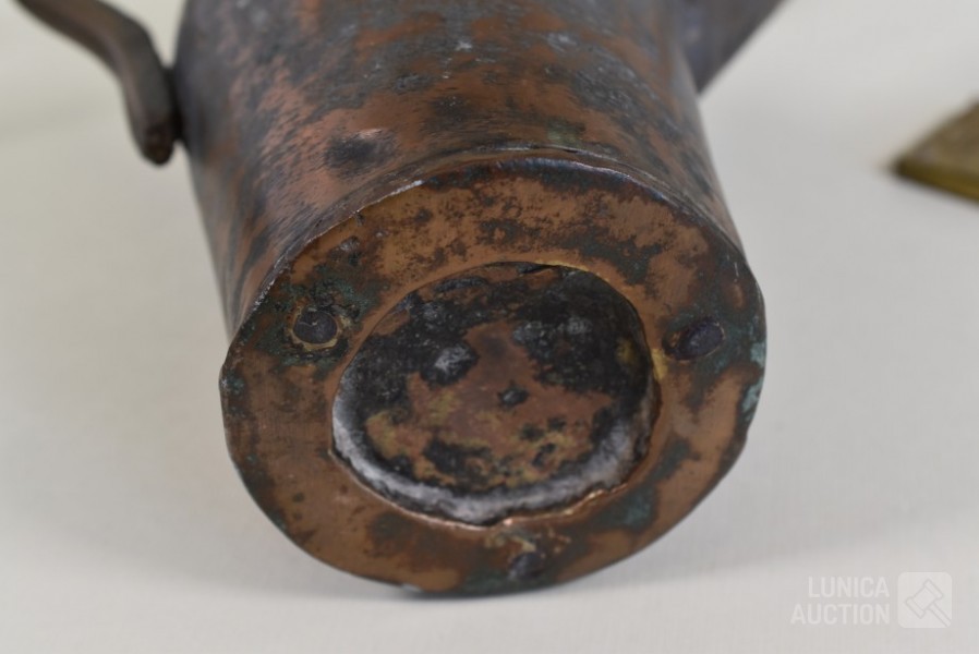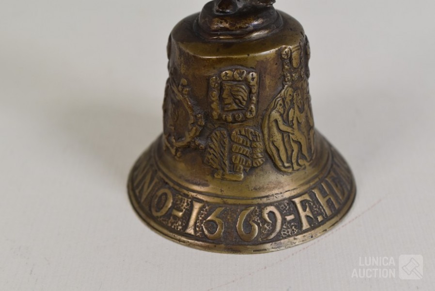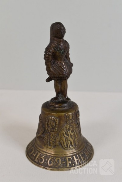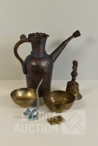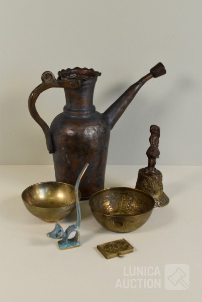 O.a. antieke bel, "Anno 1669 F. Hemony me fecit", hoogte 17 cm; antieke waterkan, hoogte 27 cm. Kat, hoogte 14 cm; antieke luciferhouder "D. Leonardt & c. Birmingham"; 2 schaaltjes, doorsnede 12 cm; Totaal gewicht ca. 3 kg.