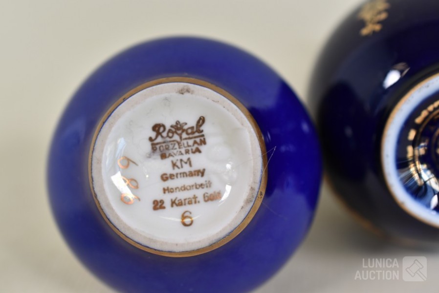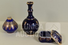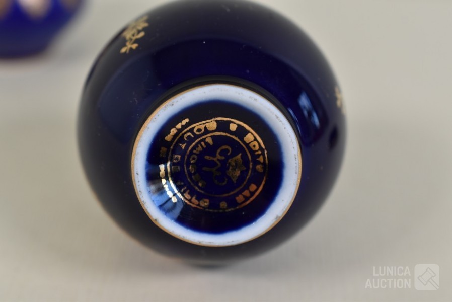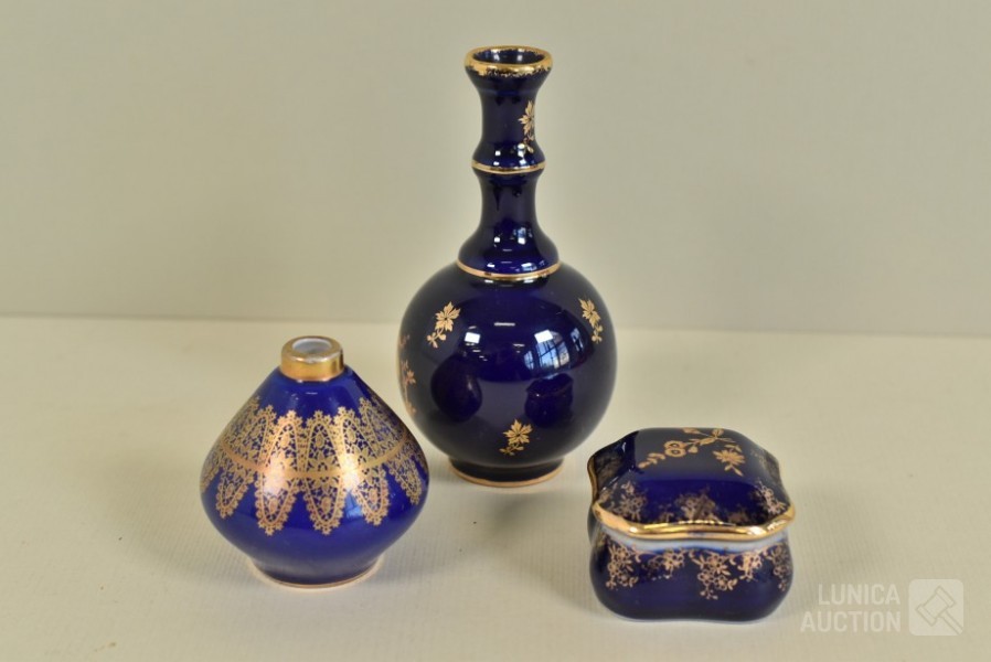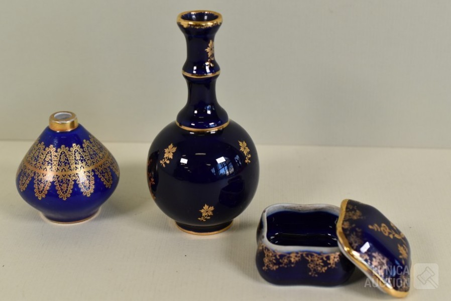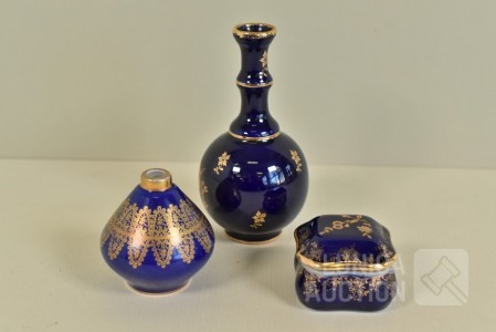 Kleur kobalt blauw; O.a. klein vaasje Bavaria, handgemaakt, met 22K goud, hoogte 6 cm; Vaas, Limoges, hoogte 12 cm; Sieradendoosje, hoogte 3,5 cm.