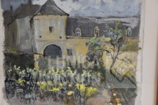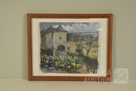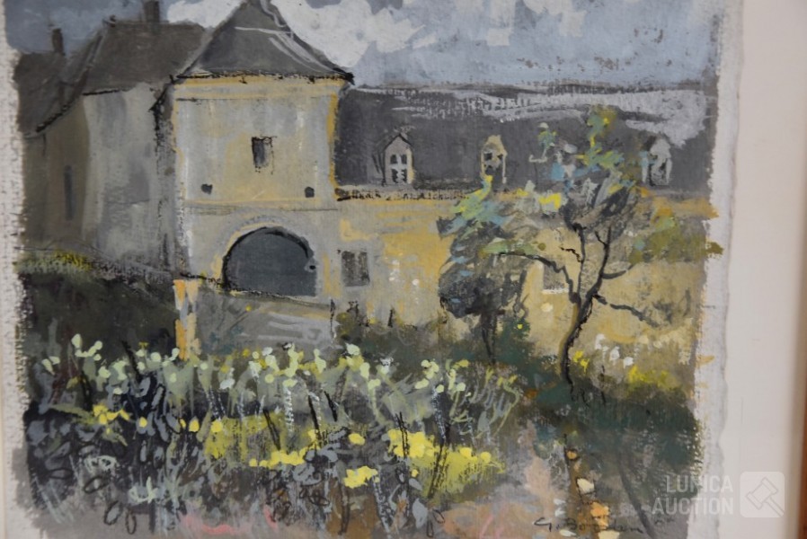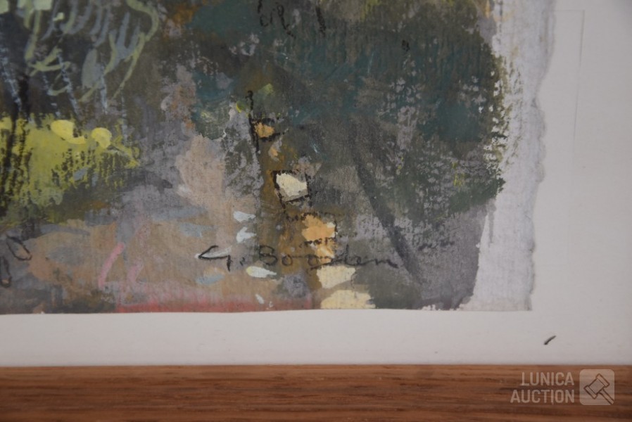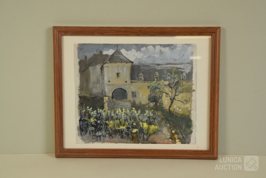 Gouache op papier, ingelijst achter glas. Gesigneerd R.O., Afmeting 38x30 cm.