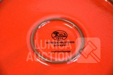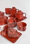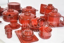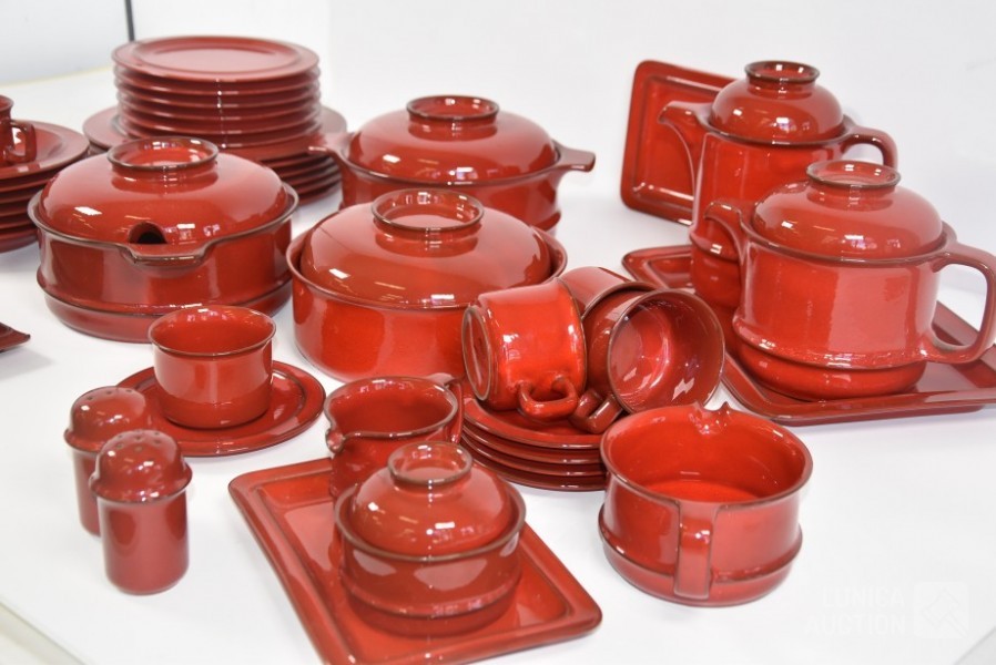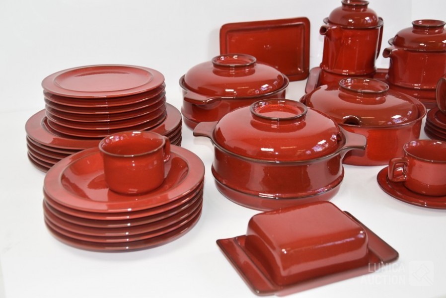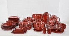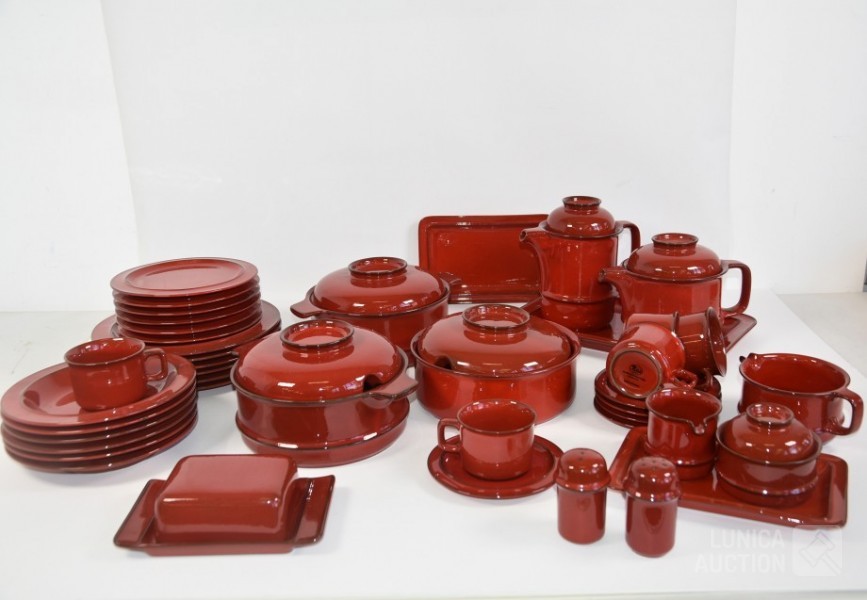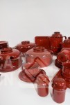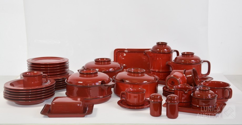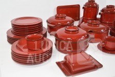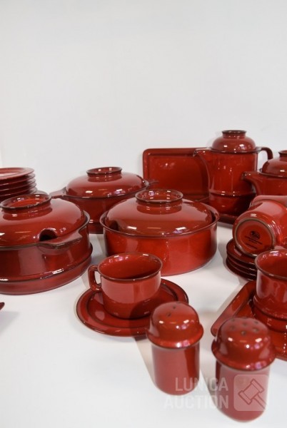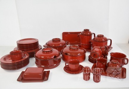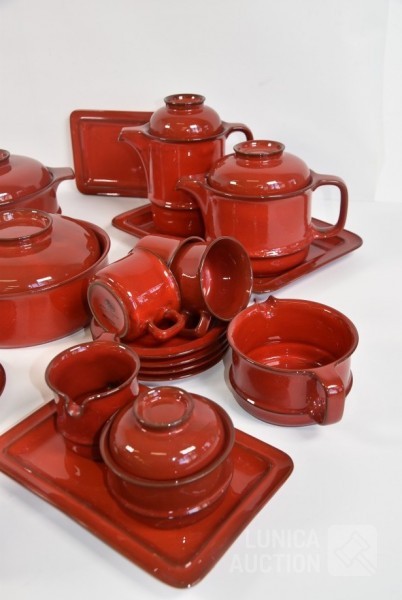 Ontwerp RENÉE NEUE, jaren '70. Kleur donkerrood. Hooggebakken steengoed met glazuur. O.a. kop en schotels; grote borden Ø 25 cm; Kleine borden Ø 20 cm; Diepe borden Ø 21 cm; Koffiekan; Theepot; Melk en suikerpot; Botervloot, enz. Mooi servies. Lichte gebruikerssporen op het glazuur.