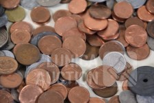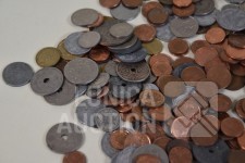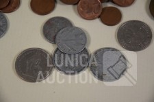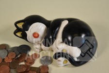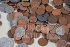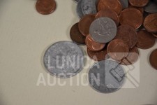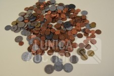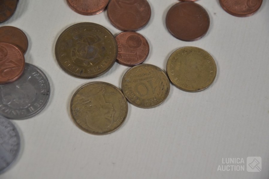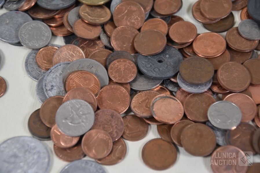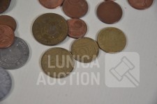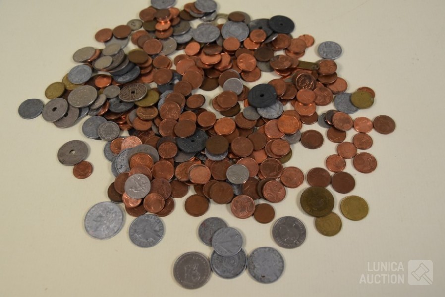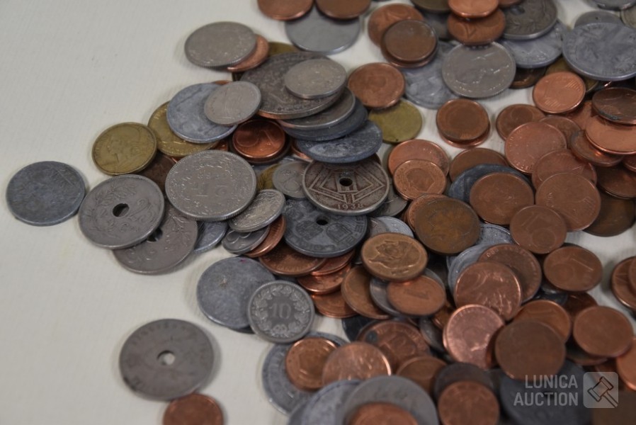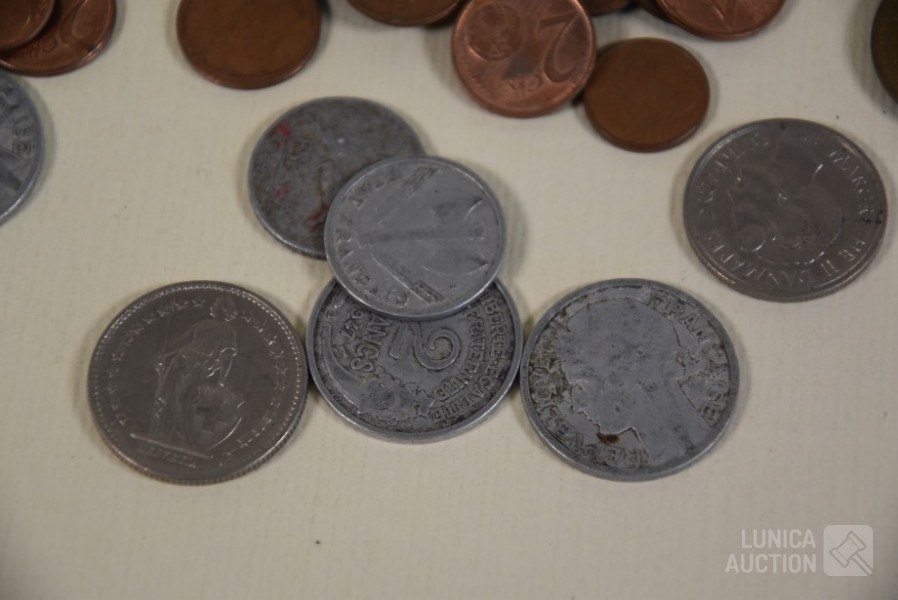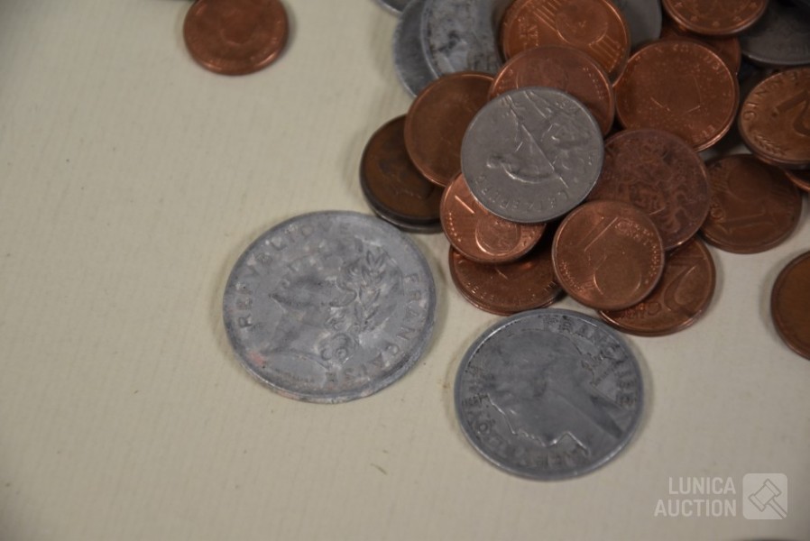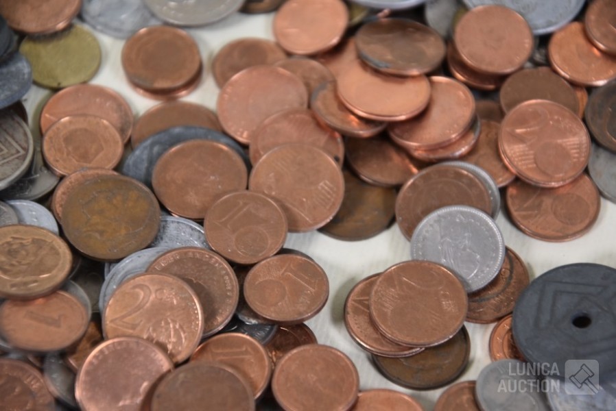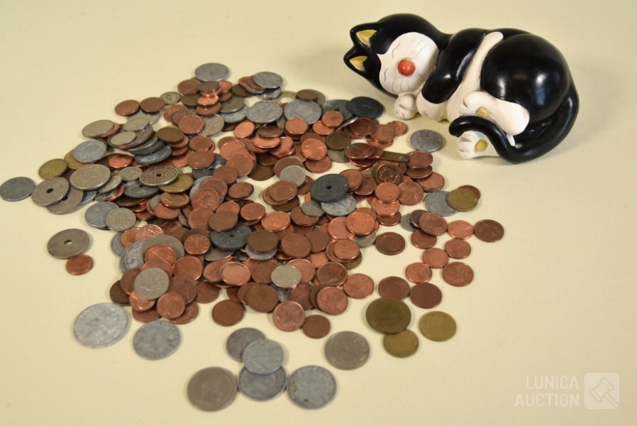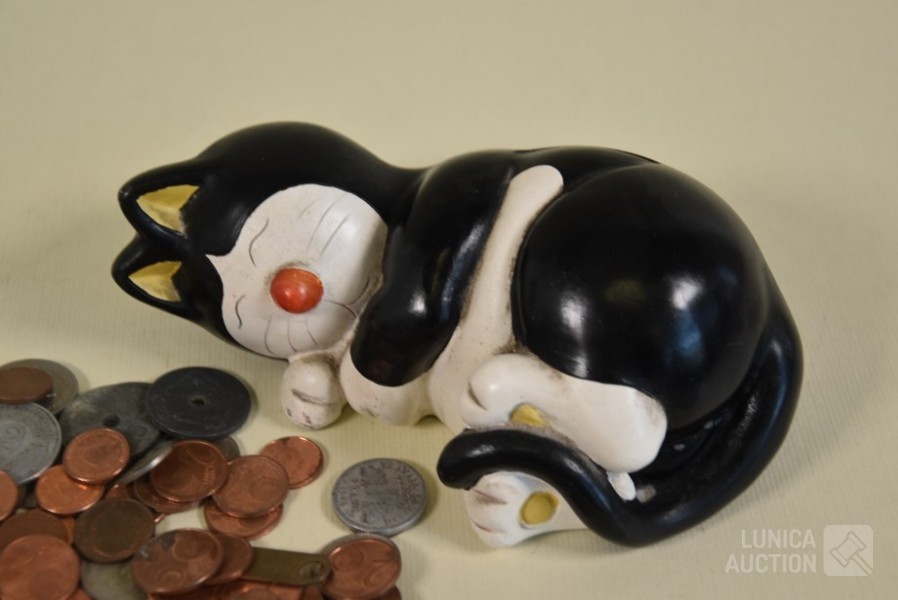 o.a. koperen 1 en 2 cent Euromunten;1 en 2 francs, Frankrijk, uit jaren '40; 25 centimes, Belgie, uit de periode 1920/1940; 2,5 gulden munt uit 1959; enz. Inclusief lege spaarpot in de vorm van een kat.