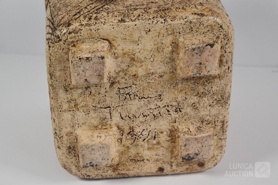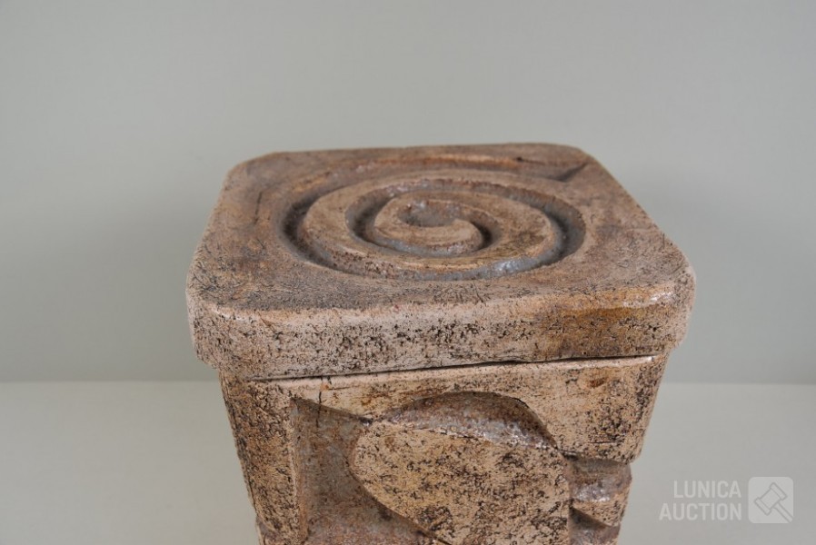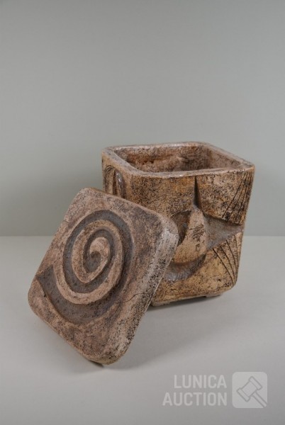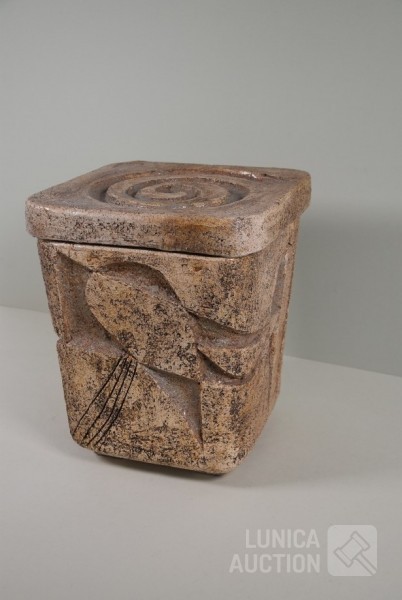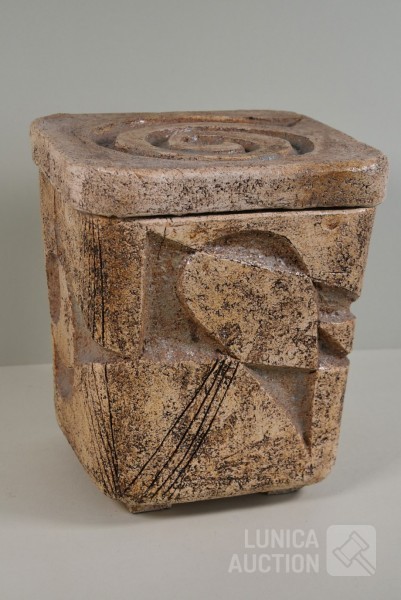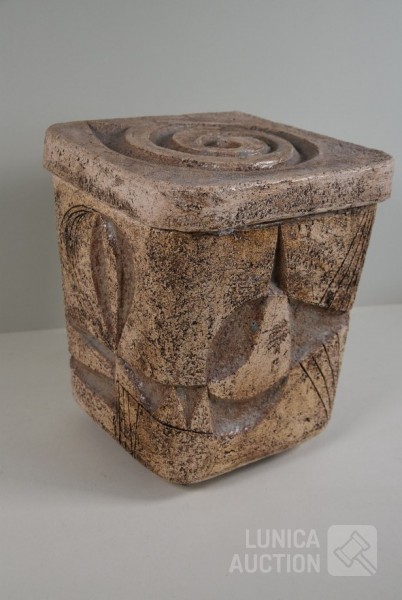 Onderzijde gesigneerd. Afmeting 26x26x34 cm. Gewicht 16 kg!. Pot heeft diverse bakscheuren, niet storend.