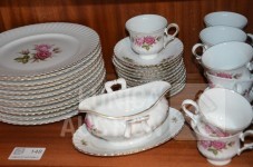 o.a. grote borden, kleine borden, kop en schotels, sauskommen, botervloot, koffiekan. Niet of nauwelijks gebruikt.