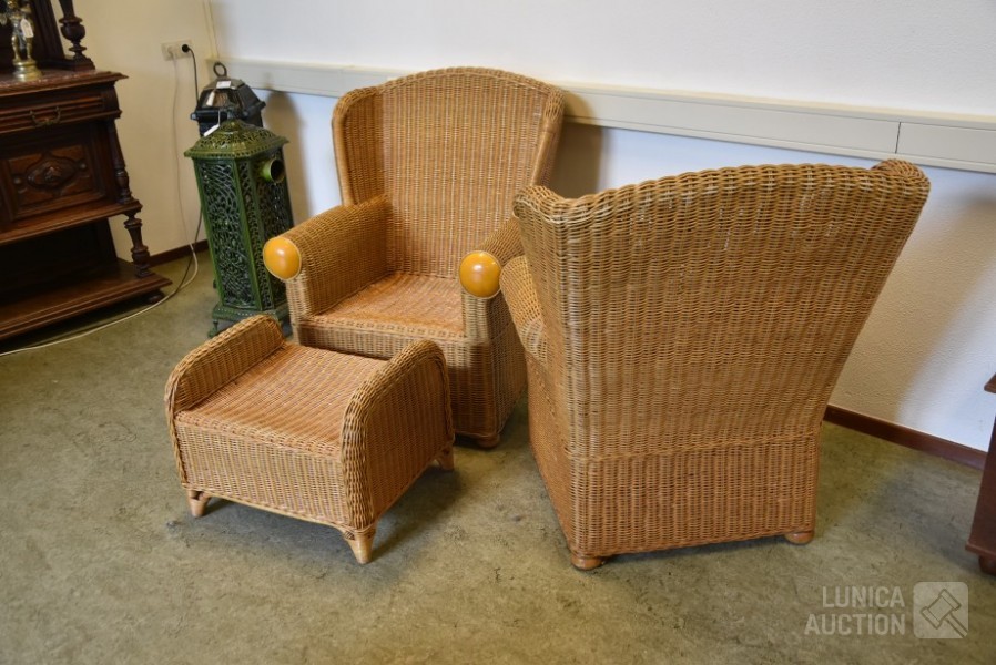 rotan, 2x oorfauteuil met 1 voetenbank. Afmeting fauteuil (bxdxh) 78x78x100 cm en voetenbank 59x50x45 cm. In goede staat.