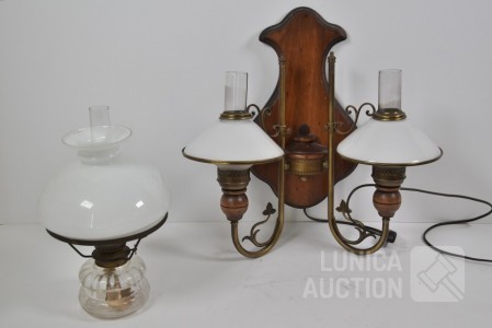 Wandlamp, afmeting (bxh) 30x45 cm; Tafellamp , hoogte 36 cm. Lampen hebben glazen kappen.