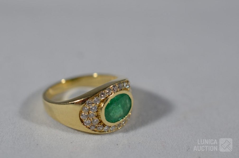ringmaat 18 mm, met briljanten en ovalen smaragd. Gewicht ca. 8,5 gram. Inscriptie 14K D,056