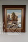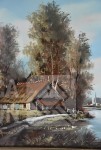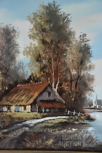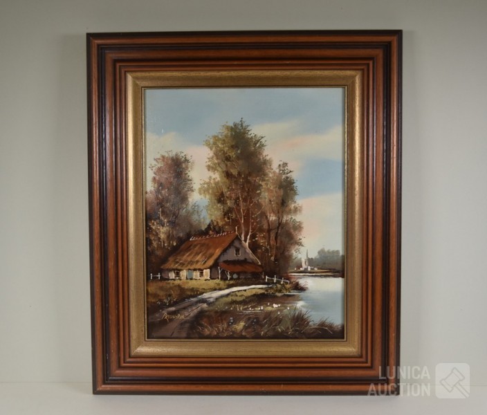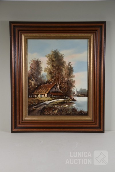 olieverf op doek, "huis aan het water"