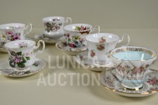 8 verschillende decors; o.a. decor "chatelaine","forget me not", "anemones", "serena", "mayflower", "radiance". De 8e set is "wild flowers " van Queens porselein