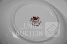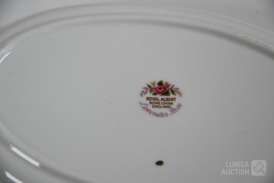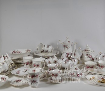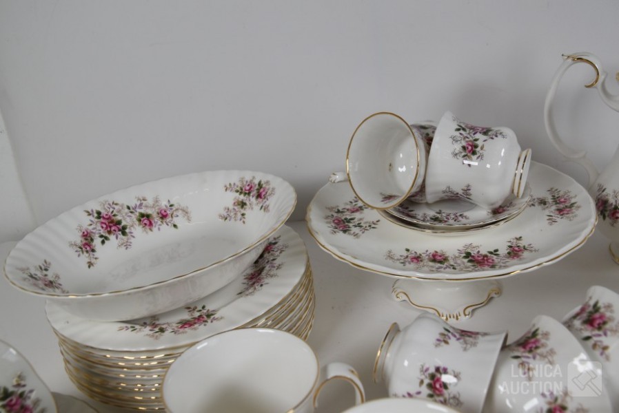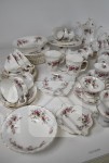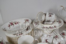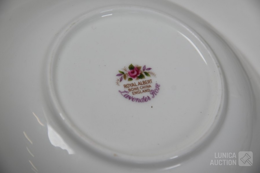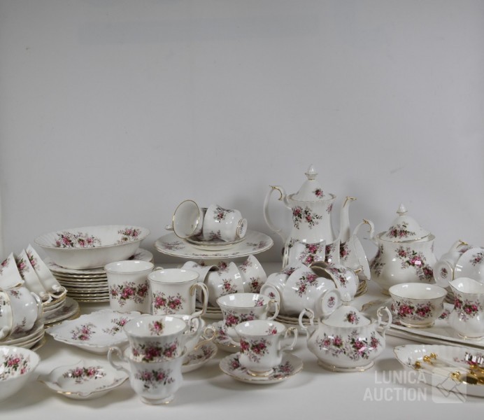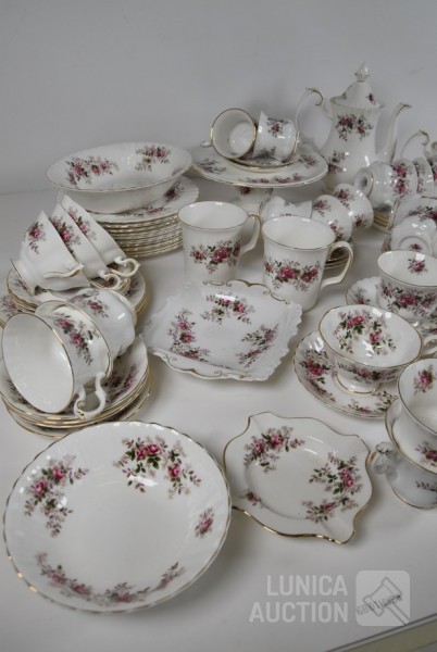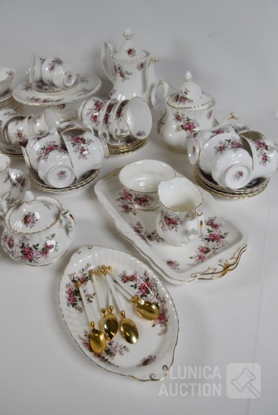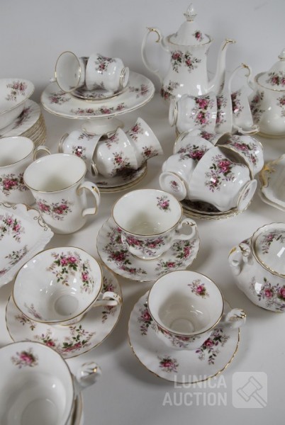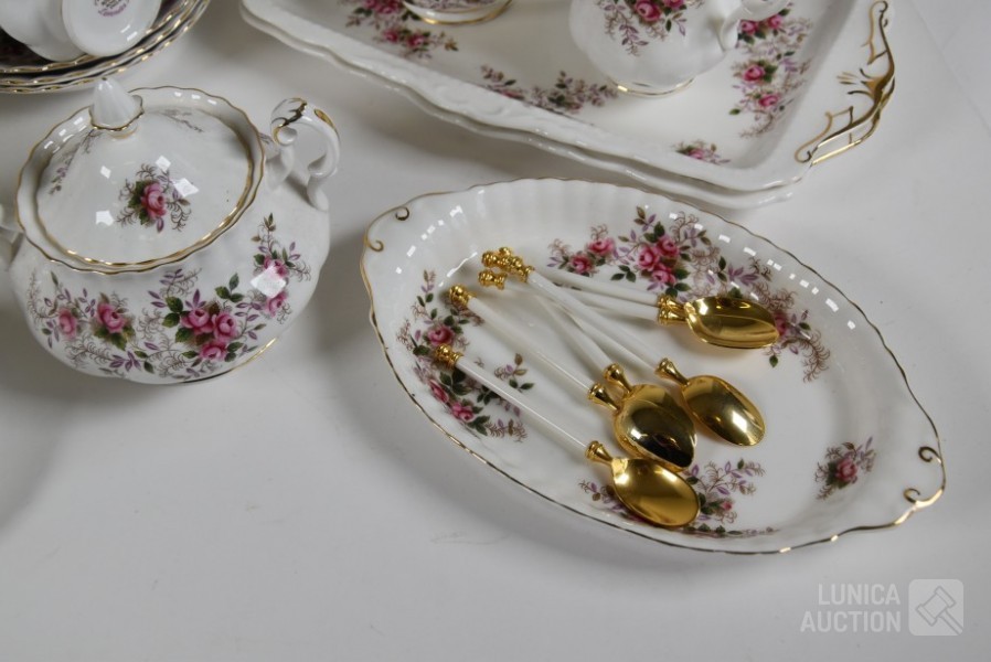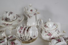 O.a. Koffiepot, hoogte 23 cm; Theepot, hoogte 17 cm; 16x set kop en schotel groot; 5x set kop en schotel klein; asbak; 10 grote borden, doorsnede 21 cm; diverse schalen; roomstel; 6 theelepels, goud verguld; taartplateau op voet; enz. Mooie verzameling.