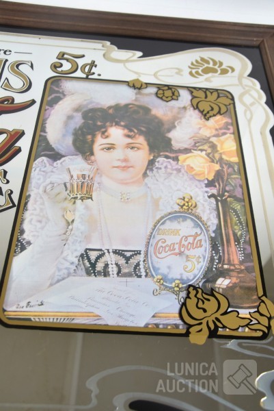 spiegelglas, ingelijst, afmeting 89x63 cm en 63x89 cm. In één spiegel heeft print van "vrouw" waterschade.