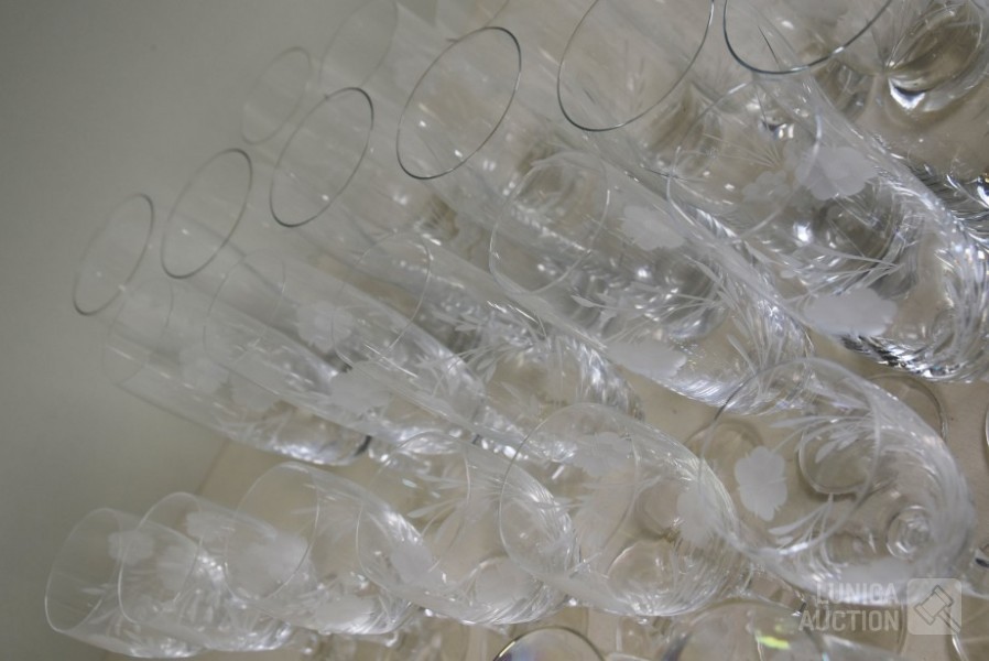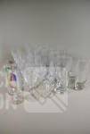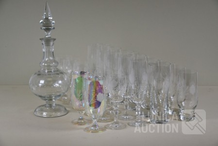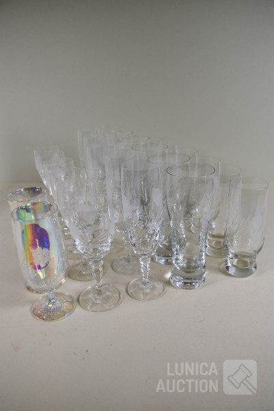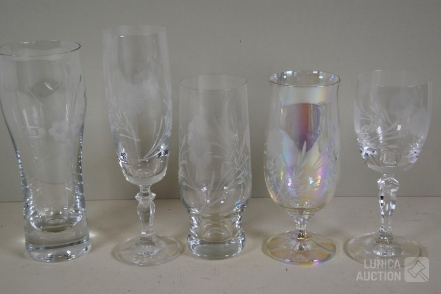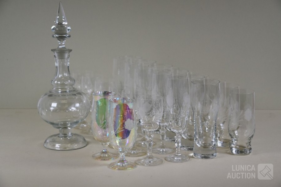 5 modellen kristalglazen en grote karaf met stop. O.a. bierglazen, champagneglazen, wijnglazen, longdrink enz. Hoogte karaf 38 cm. 2 glazen hebben metallic glans